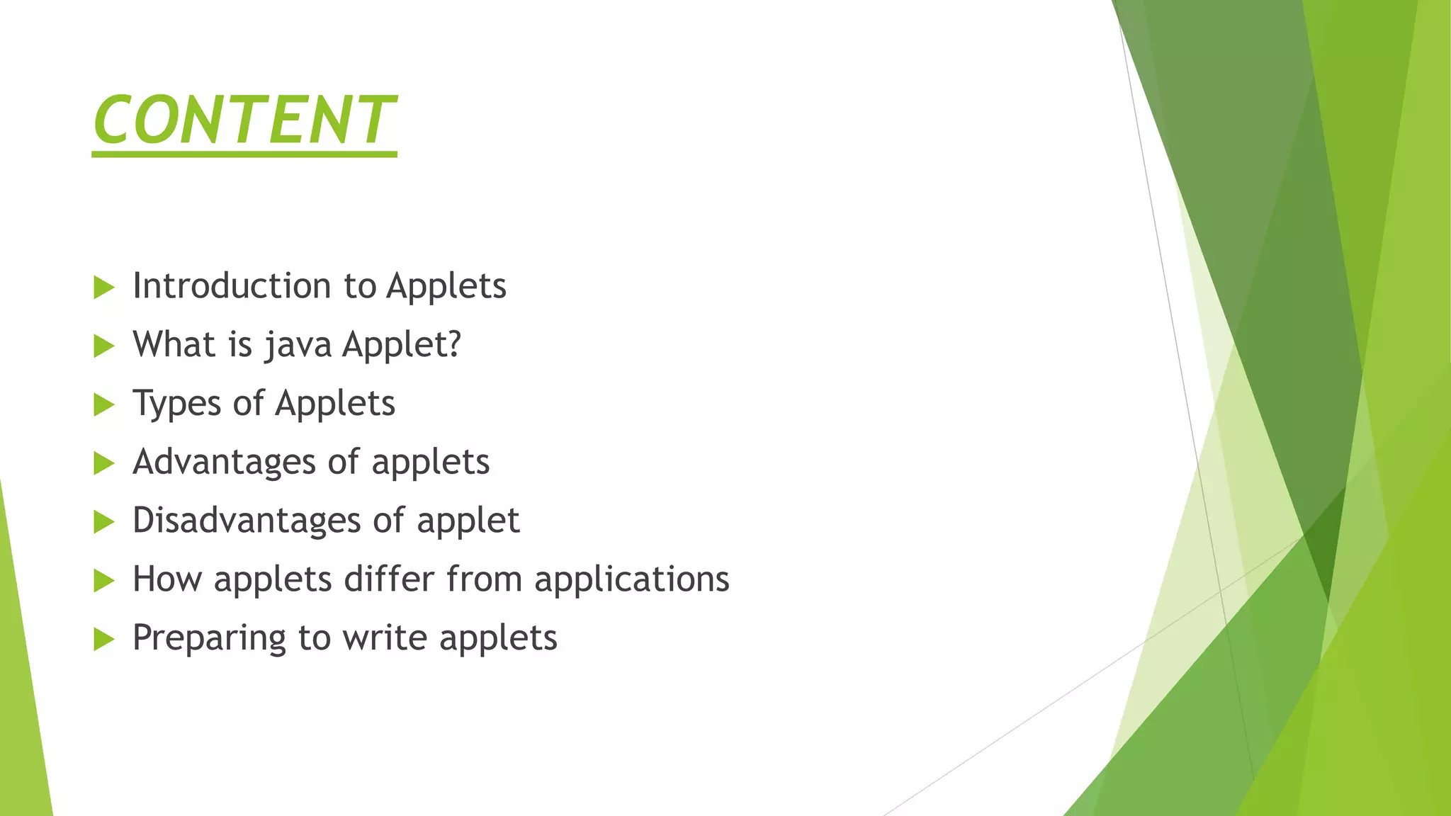 - An applet is a Java program that runs in a web browser and is embedded in an HTML page. It must subclass the Applet class.