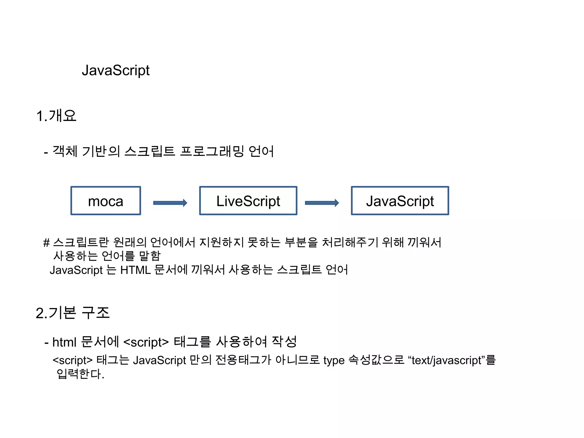 # 스크립트란 원래의 언어에서 지원하지 못하는 부분을 처리해주기 위해 끼워서