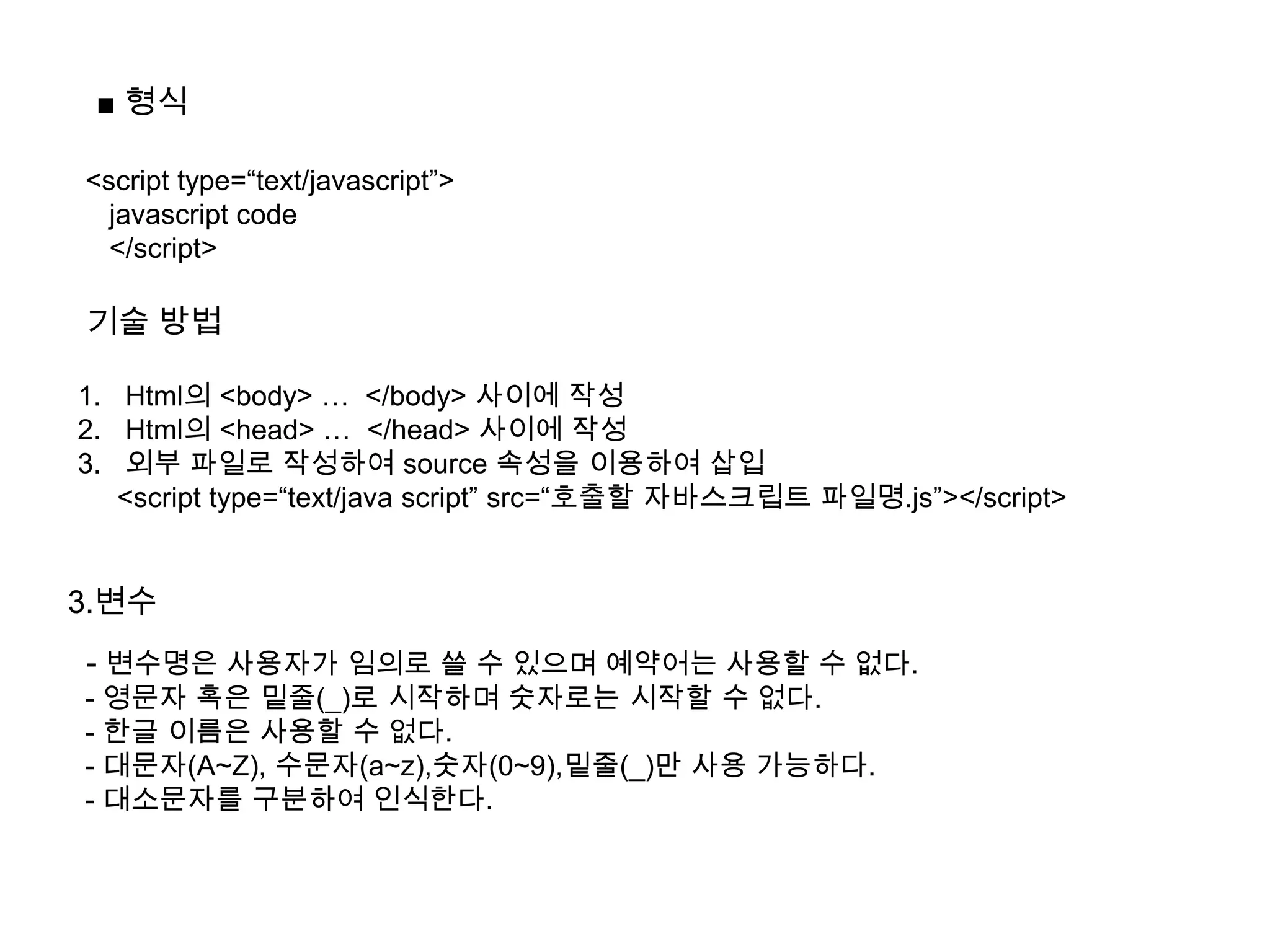 <script type=“text/java script” src=“호출할 자바스크립트 파일명.js”></script>