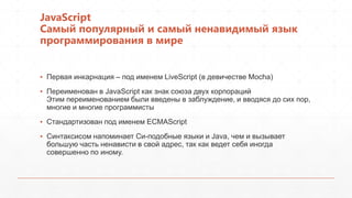 Документ обсуждает язык программирования JavaScript, его историю, использование и распространенные ошибки, связанные с синтаксисом и областью видимости переменных. Он также затрагивает важность соблюдения современных практик кодирования, таких как использование 'strict mode', а также инструменты для юнит-тестирования и организации непрерывной интеграции. Приведены рекомендации по обучению JavaScript и ссылки на дополнительные ресурсы для разработчиков.