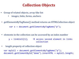 This document discusses HTML collections and event handling in JavaScript. It provides examples of how to access elements in HTML collections using methods like getElementsByTagName. It also covers different types of events like click, mouseover, form submit and how to attach event handlers using inline, traditional and modern approaches. It discusses timing events like setTimeout and setInterval. Finally it covers event propagation models of bubbling and capturing.
