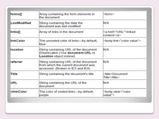 The document summarizes key aspects of the window and document objects in JavaScript: