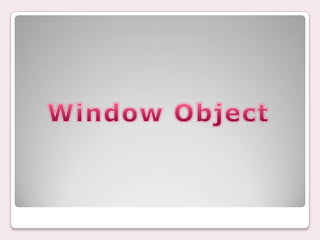 - The window object represents the browser window and contains the document. Global variables and functions are properties and methods of the window.