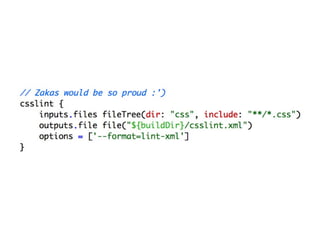 This document discusses tools and techniques for automating JavaScript development tasks to improve code quality. It recommends using tools like JSHint for static analysis, PhantomJS for testing, Closure Compiler for optimization, and Gradle for building. It also recommends setting up continuous integration with Jenkins to run tests and metrics on every code change and prevent defects. The document stresses that automation and conventions help enforce best practices and make code more understandable for future engineers.