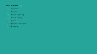 The document discusses JavaScript compilation and execution. It describes how the JavaScript engine first goes through a compilation phase, creating variable objects and determining scope, before executing code. During execution, it first enters a global execution context and then creates new execution contexts for each function invocation, with their own variable objects and scope chains. It provides examples to demonstrate how code is compiled and executed, including variable and function declarations and how scopes and contexts are set up.