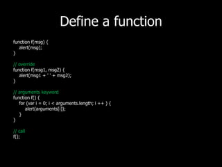 This document discusses JavaScript functions and related concepts. It defines functions, classes, and methods. It shows how functions can take arguments, be passed as callbacks, return other functions, and create closures. Classes can be defined using functions with the new keyword or by adding to prototypes. Built-in types like Number, String, and Array can be constructed or assigned directly. Functions are first-class objects that can be assigned and passed around.