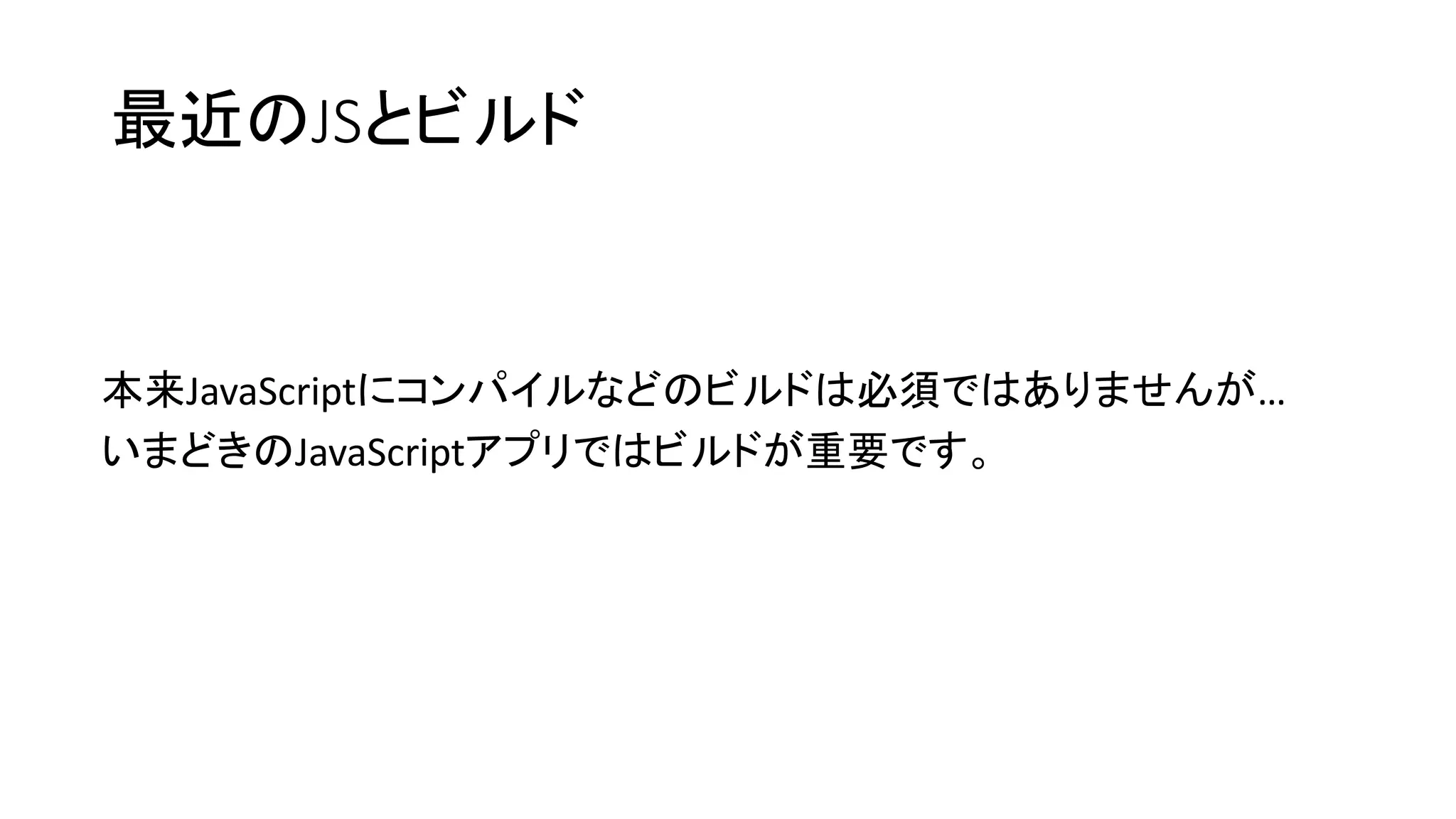 最近のJSとビルド 本来JavaScriptにコンパイルなどのビルドは必須ではありませんが… いまどきのJavaScriptアプリではビルドが重要です。