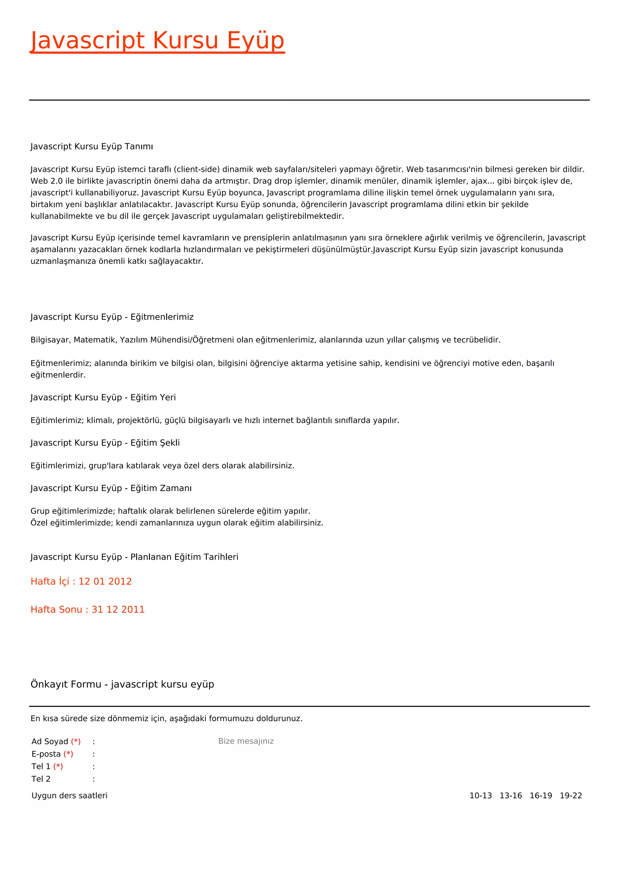 Javascript Kursu EyĂĽp - Planlanan EÄźitim Tarihleri