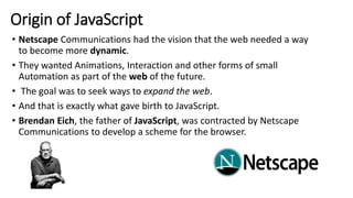 JavaScript is a scripting language used to make web pages interactive. It was created in 1995 by Brendan Eich at Netscape to add interactivity to web pages beyond just images and text. Some key points: