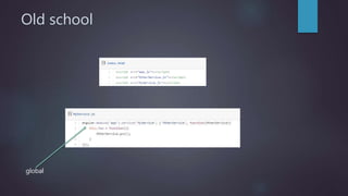 This document discusses JavaScript modules and module loading. Traditionally, JavaScript used a global namespace which could cause conflicts, but modules allow encapsulation and privacy. Modules are now commonly defined and loaded using file paths where each file represents a single module, and module loaders like require() are used to import dependencies between modules during bundling into a single file.