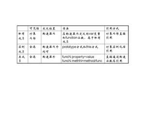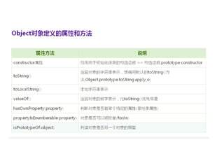 文档介绍了 JavaScript 的数据类型、对象、函数及其相关概念,包括弱类型的特点、内置类型及其特征、实例和构造函数的使用,以及如何动态管理对象的属性和方法。它还解释了关键字如 undefined、NaN 和 Infinity 的作用,以及匿名函数和 eval() 的用法。总体上,该文档是关于 JavaScript 编程的基本知识和高级特性的详细说明。