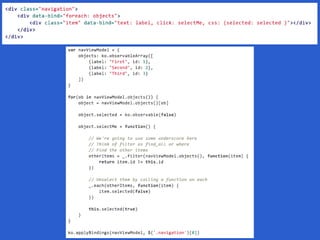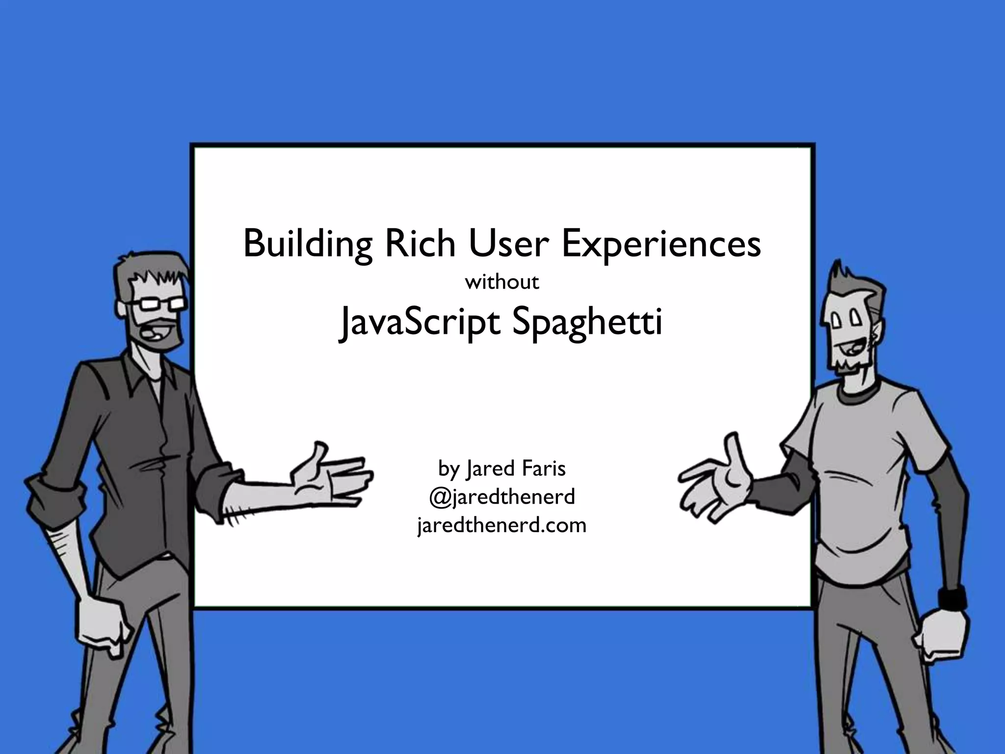 This document discusses how to build rich user experiences with JavaScript without creating "spaghetti code". It advocates for pushing events rather than state between components, writing small discrete bits of code, and fully decoupling components. Specific techniques mentioned include using design patterns like mediator and observer, frameworks like Knockout and Backbone, namespacing, inheritance, and testing isolated layers. The goal is to structure JavaScript applications similarly to server-side code by treating the client-side seriously and applying best practices around modularity and loose coupling.