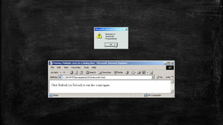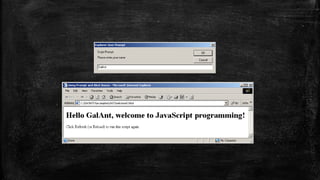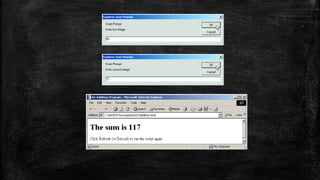 This document provides an overview of JavaScript and jQuery. It covers JavaScript syntax, values, operators, expressions, keywords, comments, objects, functions, conditions, arrays, and the Date object. It also discusses using JavaScript for dynamic web pages, DOM manipulation, and DHTML. Additionally, it provides examples of simple JavaScript programs for adding numbers and using prompt boxes. jQuery is also listed as a topic covered but not described.