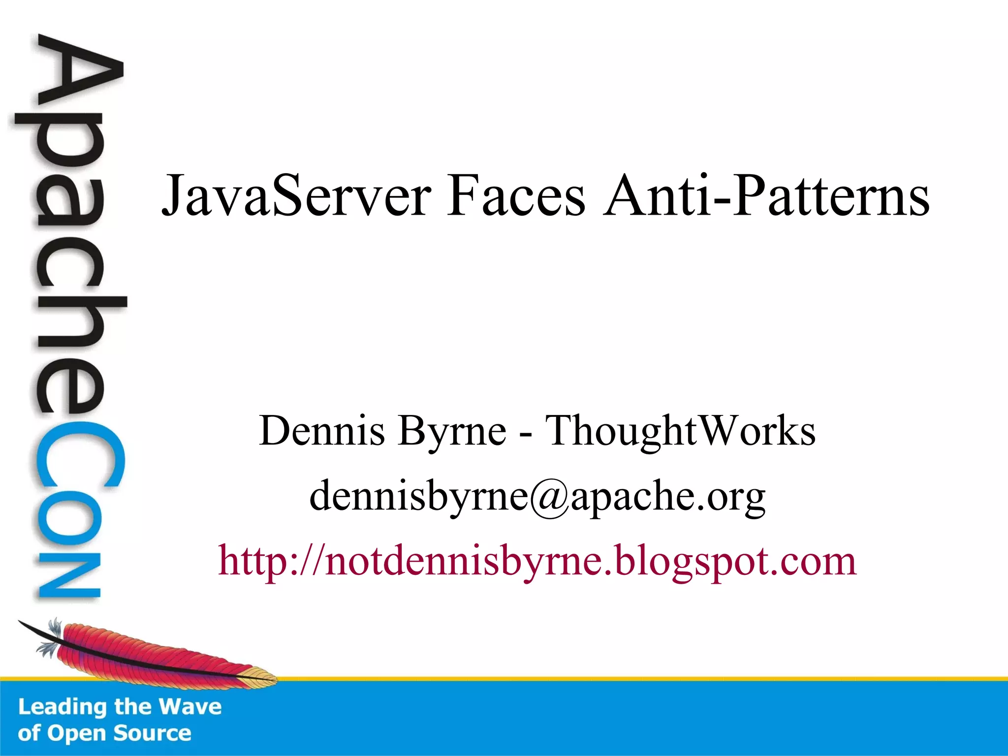 This document discusses several common anti-patterns in JavaServer Faces (JSF) development and provides solutions to avoid them. It covers issues like validating setters, dependency injection, thread safety, vendor lock-in, the Law of Demeter principle, and database performance problems like N+1 queries. The document is written by Dennis Byrne and provides best practices for building scalable and maintainable JSF applications.