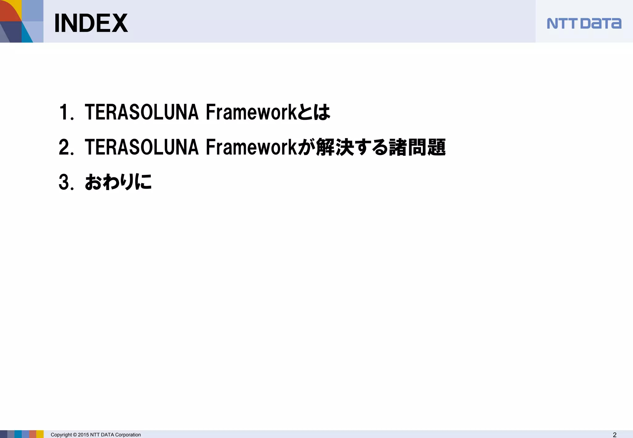 NTT DATA Corporation Copyright © 2016 NTT DATA Corporation 「TERASOLUNA」及びそのロゴは、日本及びその他の国おける株式会社NTTデータの商標または登録商標です。 その他、記載されている会社名、商品名、サービス名等は、各社の商標または登録商標です。