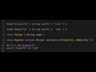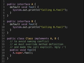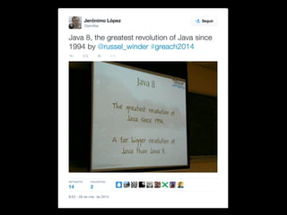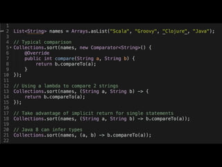 The document presents a comparison between Groovy and Java 8, highlighting the features and improvements introduced in Java 8, such as lambda expressions, stream API, and optional types. It emphasizes Groovy's capabilities, such as dynamic typing, closures, and traits, which enhance Java's static features. The conclusion recommends utilizing both languages for different advantages in JVM development.