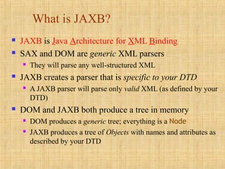 JAXB is a Java framework that generates Java classes from an XML DTD or schema. It allows Java objects to be converted to and from XML. The document discusses what JAXB is, how it works, and how to customize the generated Java classes through a binding schema. Key points include: JAXB generates classes specific to an XML DTD, it requires a DTD or schema as input, and a binding schema can customize how classes are generated to map XML elements to Java properties.
