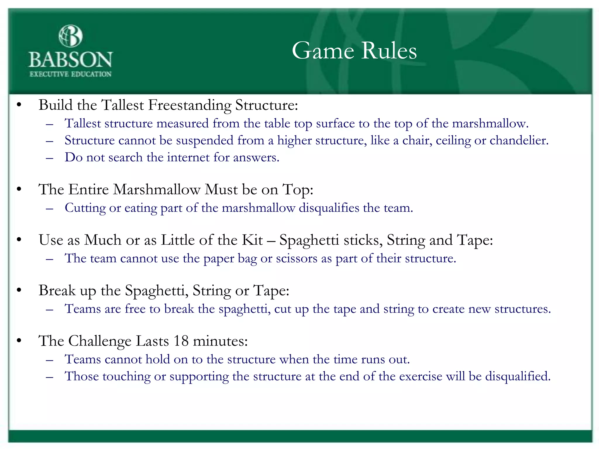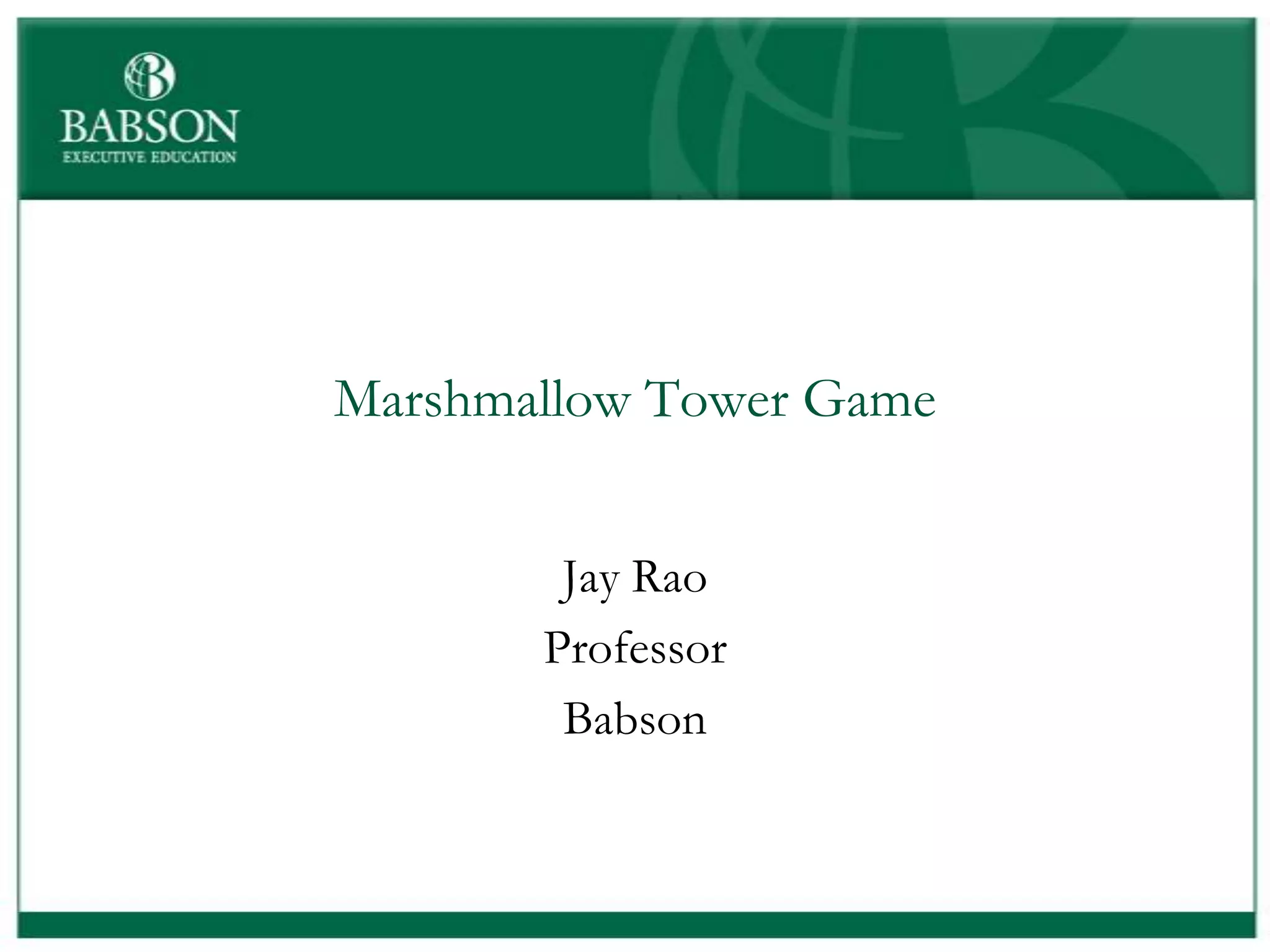 The document outlines the rules and lessons from the Marshmallow Tower game, emphasizing teamwork and rapid prototyping. It discusses broader findings related to innovation, highlighting the high failure rate of new products and the ineffectiveness of current innovation strategies. Key insights include the importance of diverse skills, the need for emergent strategies, and learning through action to foster effective innovation processes.