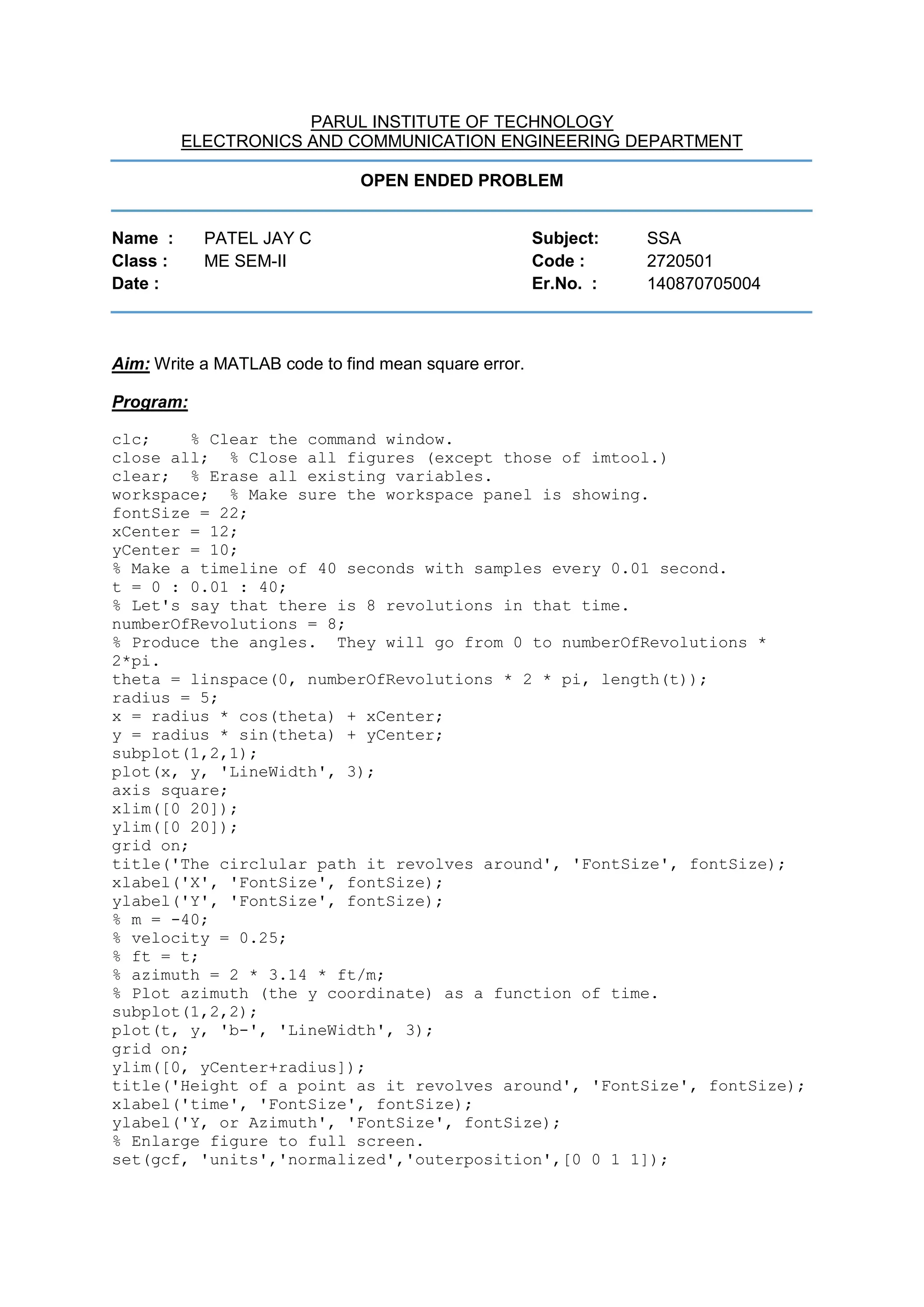 This MATLAB code generates a circular path by revolving a point around a center point 8 times over a 40 second period. It plots the x-y coordinates of the path in one subplot and the y-coordinates over time in another subplot. The code clears variables, sets font sizes, generates time and angle vectors, calculates x and y coordinates from the radius and angle, and plots the results with labels and axis properties. The overall aim is to generate and visualize a revolving circular path.