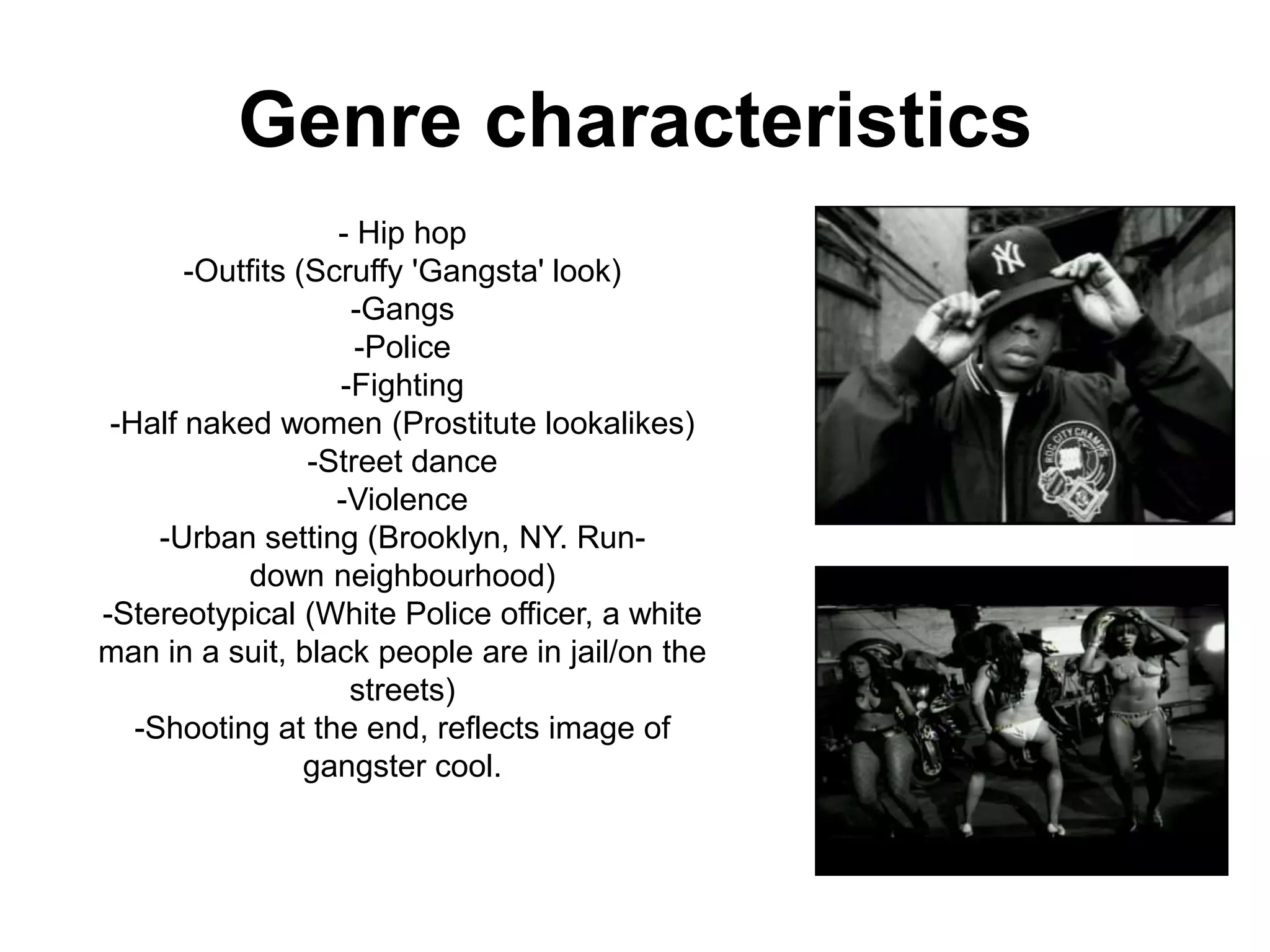 - The music video for Jay-Z's song "99 Problems" depicts stereotypical elements of hip hop culture such as gangster outfits, police, violence and crime that illustrate the song's story about gangster lifestyle and the problems that come with it.