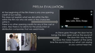 The document discusses issues with the production quality of a student film called "Bleeding in Love". It notes that there were no opening credits for the cast or crew and no logos for the production or distribution companies. It also mentions that background noises were not removed during editing, breaking up the atmosphere. There were visible cracks in continuity from filming on different days. However, the document also discusses techniques learned from making the film, including using varied camera angles, close-ups, panning and slow motion to improve quality, as well as voiceovers, lighting, and mise-en-scene to develop characters and set mood. Editing in Final Cut Pro allowed adding credits and video filters to distinguish fantasy from reality.