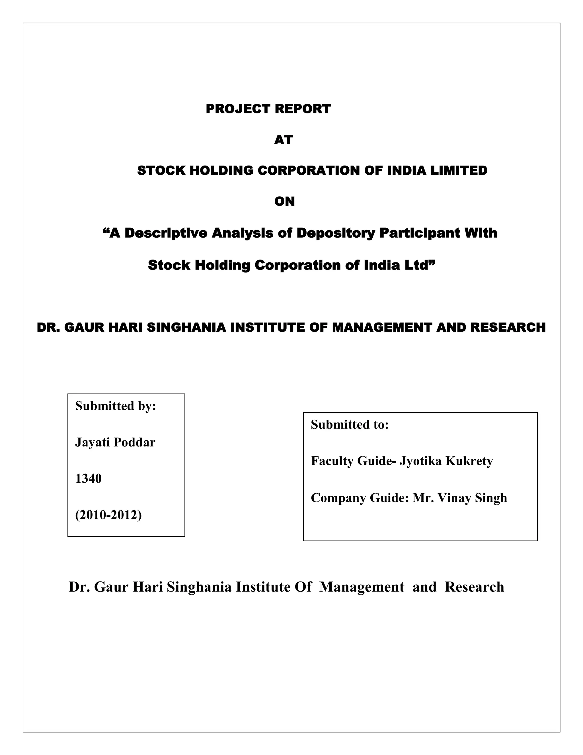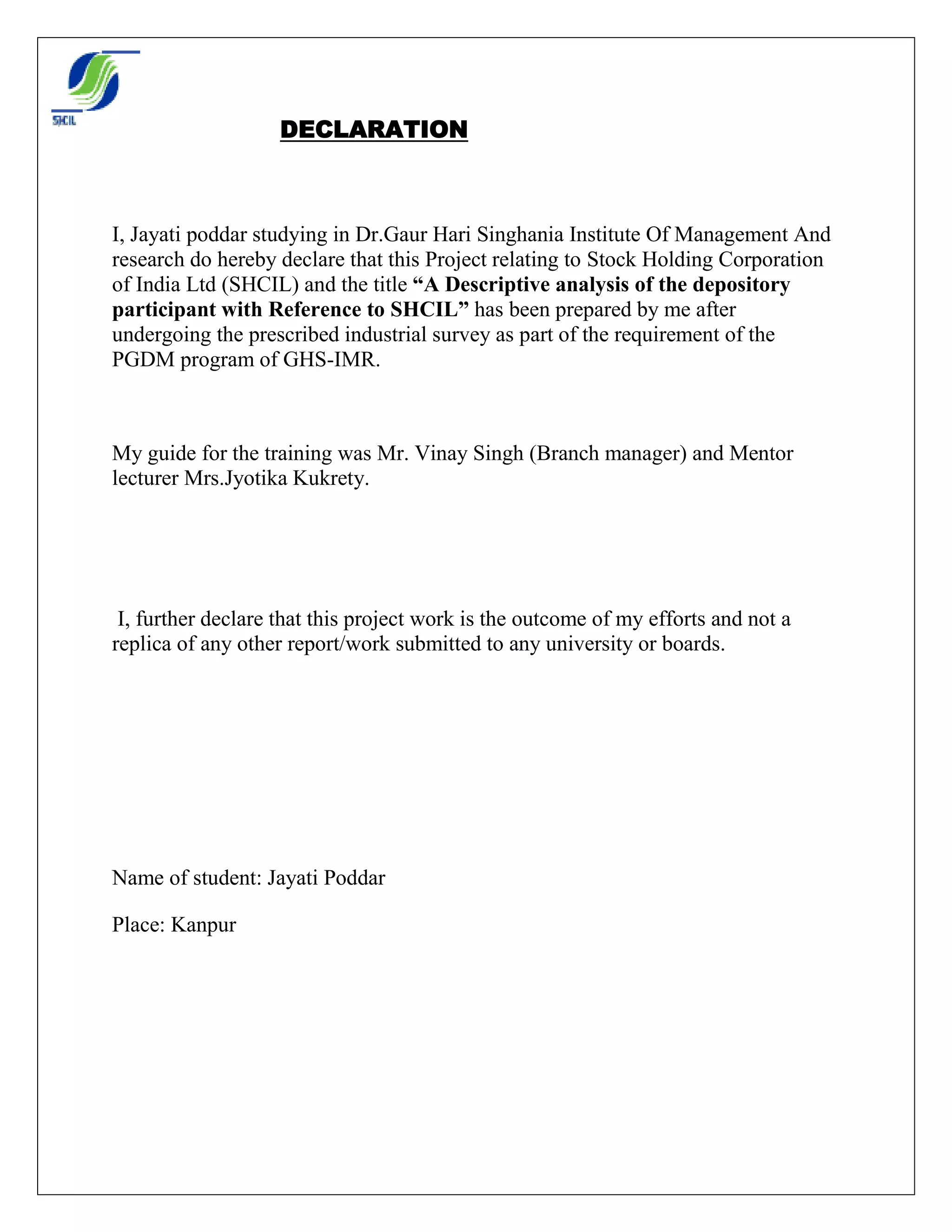 This document provides a project report on a descriptive analysis of depository participants with Stock Holding Corporation of India Ltd (SHCIL). It includes declarations, acknowledgements, executive summaries and details on opening and maintaining demat accounts with SHCIL. The objectives are to understand investor perceptions of depository participants (DPs), ascertain SHCIL's competitive position, develop SHCIL strategies to improve its market share, and offer suggestions. Limitations include the study being limited to one SHCIL branch and constraints of time and information access.
