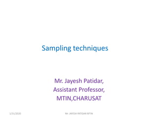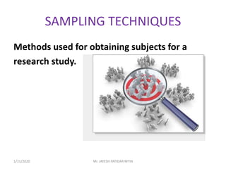This document discusses sampling techniques used in research. It defines key terms like population, sample, sampling frame, and stratified random sampling. Stratified random sampling involves dividing the population into homogeneous subgroups or strata first, then randomly selecting subjects proportionally from each strata. This ensures representation from different subgroups. Some advantages are it reduces bias, allows for comparisons between strata, and gives higher statistical precision than simple random sampling. Probability sampling methods like simple random and stratified random sampling are more reliable if a complete sampling frame is available.