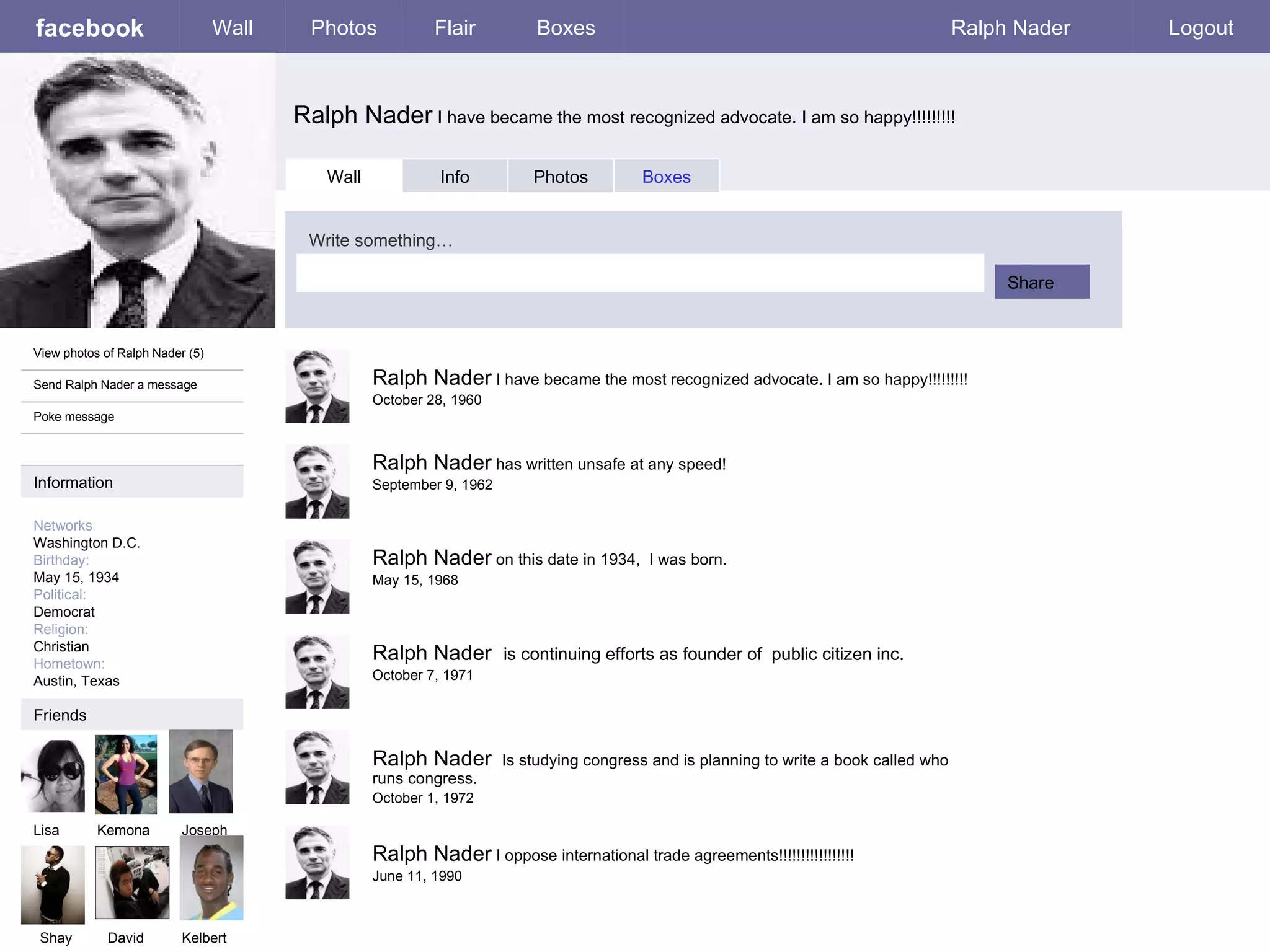facebook Ralph Nader I have became the most recognized advocate. I am so happy!!!!!!! Personal Information Wall Photos Flair Boxes Ralph Nader Logout View photos of Ralph Nader (5) Send Ralph Nader a message Poke message Wall Info Photos Boxes Basic Information Information Networks : Washington D.C. Birthday: May 15, 1934 Political: Democrat Religion: Christian Hometown: Austin, Texas Photos Networks: Washington D.C. Sex: Male Birthday: May 15, 1934 Hometown: Austin, Texas Relationship Status: Married to Kristina Nader Political Views: Democrat Religious Views: Christian Activities: investigating and writing books Interests: congress and electronics Favorite Music: lovely flowers and coward and the cowardly dogs Favorite Movies: Make it burn and Lifeless Pain Favorite TV Shows: The Jetsons and 1,000 ways to die Favorite Books: The Caged Bird and Tom Sawyer The Family Updated last Tuesday 2 Albums Just me Updated two months ago Contact Information Address: 2711 Romania Drive, Massachutes 30897 Phone Number: (987) 592-2367