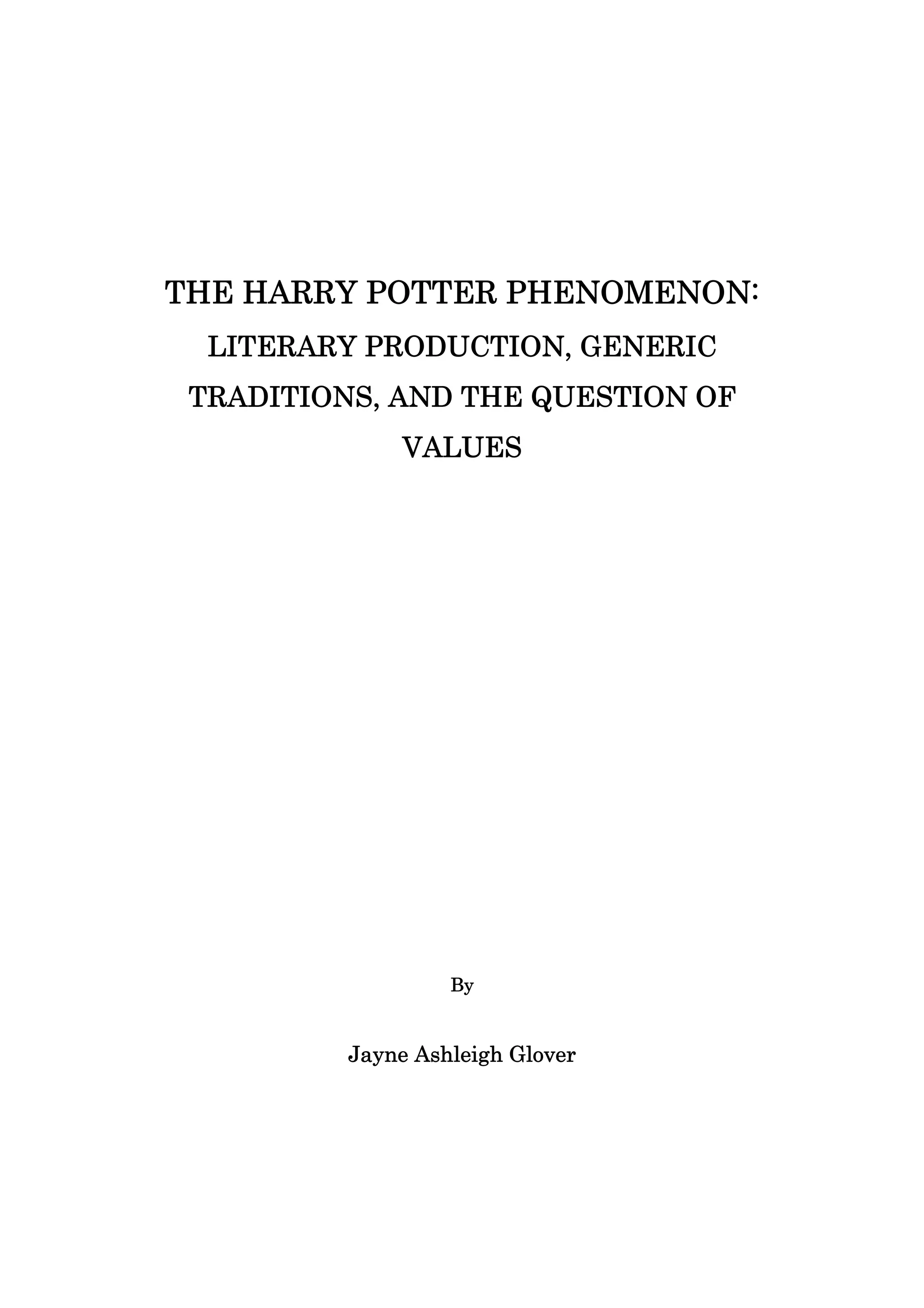 This thesis analyzes the popularity and success of the first four Harry Potter books by J.K. Rowling. It examines their publication history, marketing strategies, and how they draw from different literary genres like the school story, epic/romance, and modern fantasy. The thesis argues that Rowling's unique blending of these genres through her use of morality and values contributes to the books' complexity and widespread appeal to both children and adults. It aims to understand why the Harry Potter series has become such a global phenomenon.