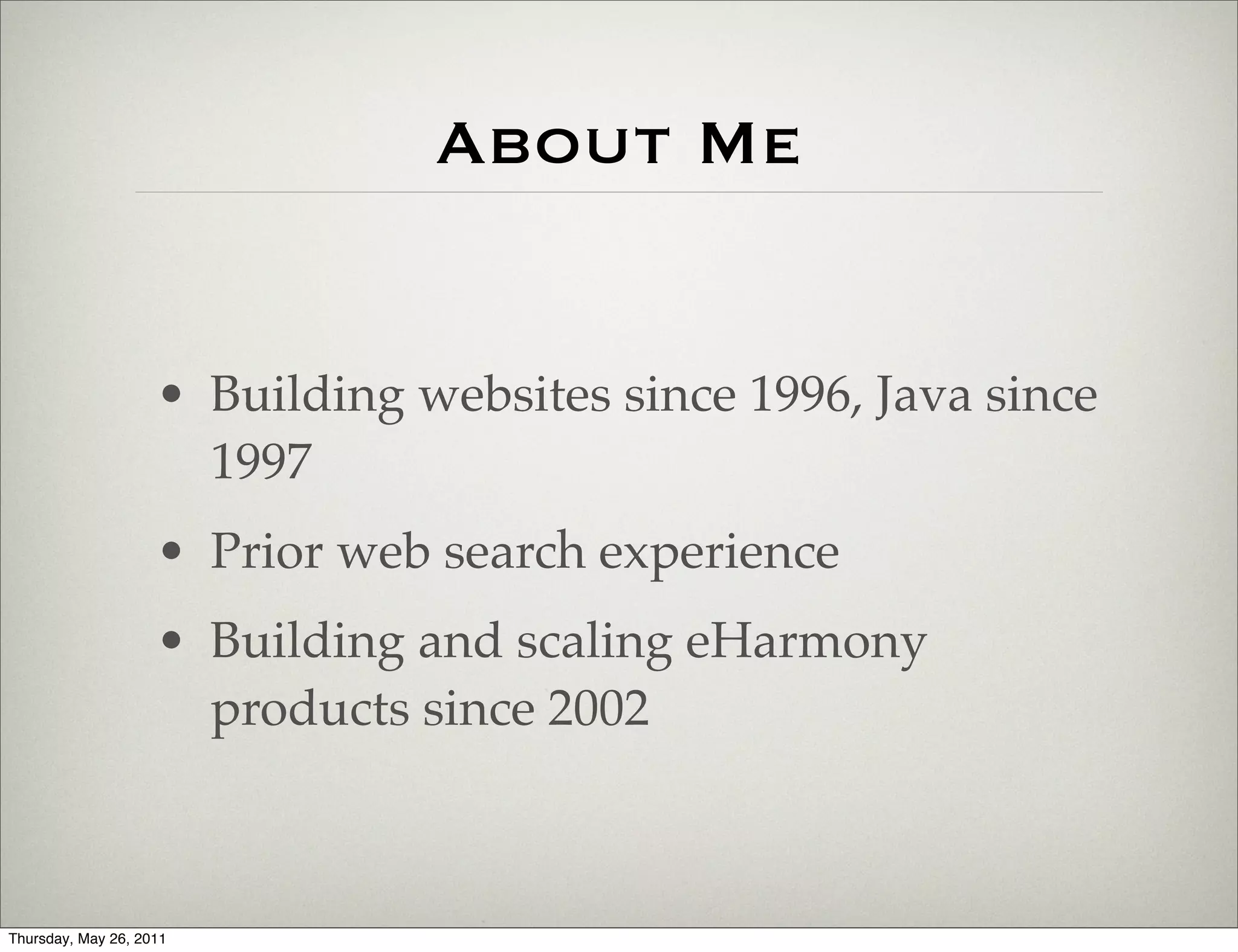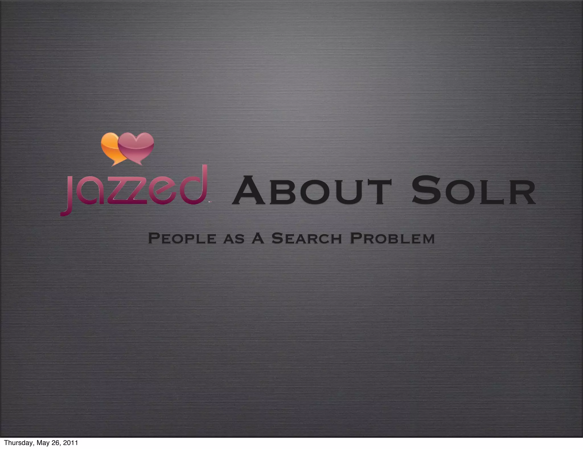 The document discusses using Solr to power the search functionality on a dating site called Jazzed. It was created by eHarmony to handle a broader range of relationships. Solr allows for fast and effective search of user profiles, and supports features like faceting, geospatial search, and querying on structured profile fields. The architecture utilizes Solr, Voldemort, and other open source tools to handle search and data storage at scale.