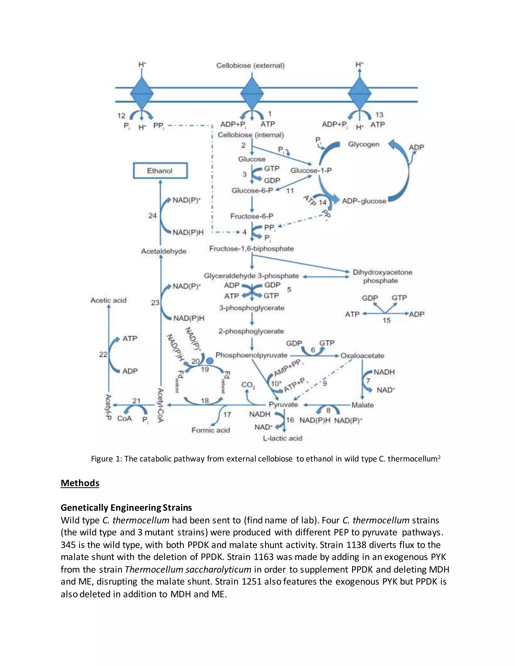 The document summarizes a study that analyzed 4 genetically engineered strains of Clostridium thermocellum with differing pathways for converting phosphoenolpyruvate (PEP) to pyruvate. The strains were cultured and their metabolite concentrations and reversibility of reactions were measured to calculate free energy changes. Strain 1138 diverted flux through the malate shunt, strain 1163 expressed an exogenous pyruvate kinase, and strain 1251 expressed pyruvate kinase and deleted PPDK and the malate shunt. Strain 1163 had higher GDP and GTP, suggesting its PEP to oxaloacetate conversion was more efficient. Further optimizing the PEP to pyruvate pathway, such as