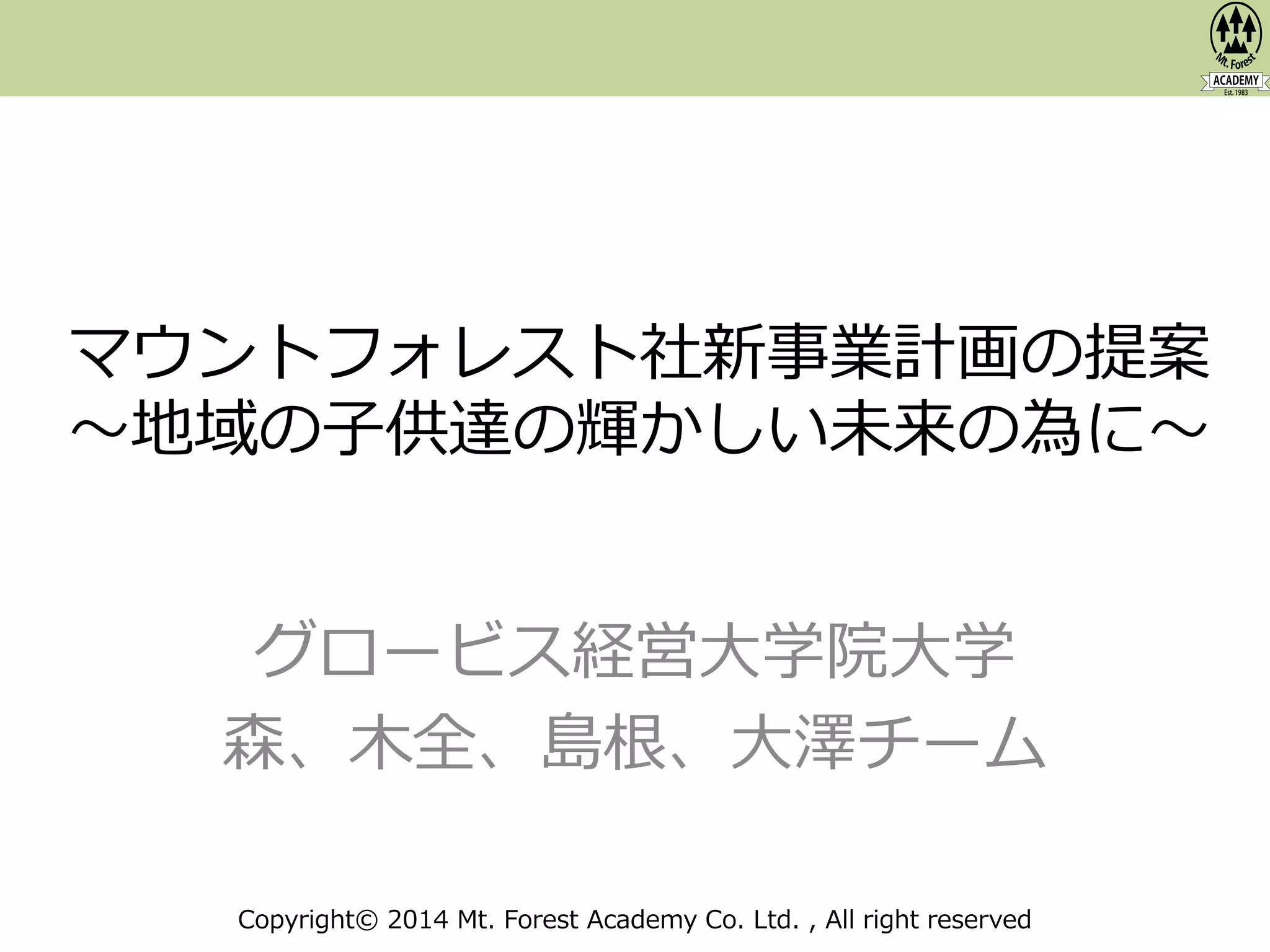 Forest Academy Co. Ltd. , All right reserved 1.現状の問題 2.課題設定 5.財務計画 3.事業再編 と新戦略 4.インプリメン テーション計画 6.まとめ 課題 抽出 課題 解決策 財務 計画 まとめ 13/42