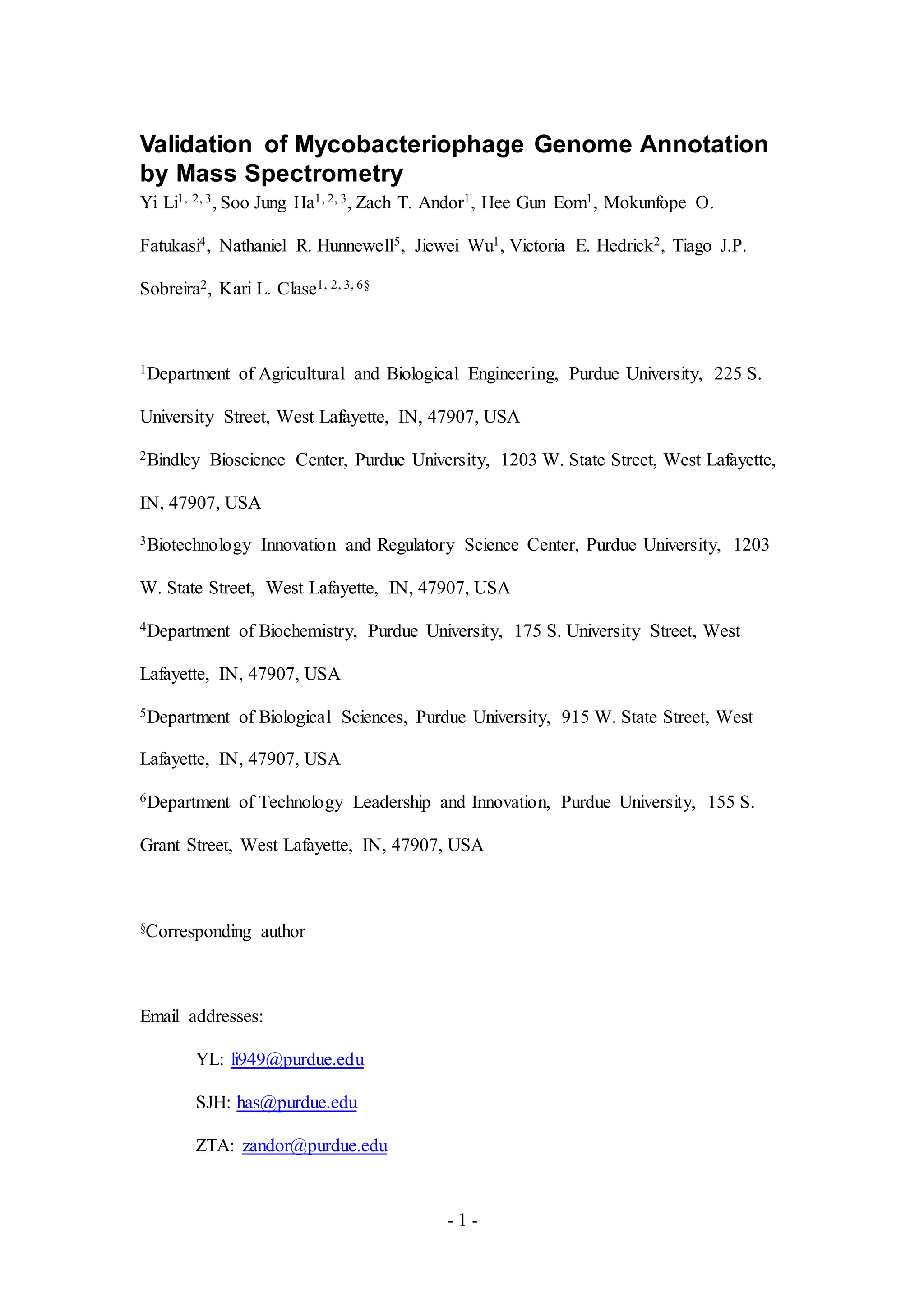 This study used mass spectrometry to validate genome annotations of nine diverse mycobacteriophages and identify their expressed proteins during infection of Mycobacterium smegmatis. Peptides matching both characterized and uncharacterized putative phage proteins were detected, validating the genome annotations. Over 100 peptides were identified for some phages, including proteins for virion structure, DNA replication, and host lysis. The study demonstrates mass spectrometry can rapidly validate phage genome annotations and identify expressed proteins, aiding characterization of phage-host interactions.