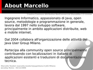 Marcello Teodori presenta il framework JBoss Seam, basato su Java EE 5, che include funzionalità come annotazioni, EJB3, e JavaServer Faces per semplificare lo sviluppo di applicazioni. Il gruppo Java User Group Milano, fondato nel 2002, supporta la comunità di sviluppo Java organizzando eventi e fornendo risorse. Il documento discute anche le differenze tra Seam e altri framework come Spring, evidenziando le sue caratteristiche uniche e future direzioni di sviluppo.