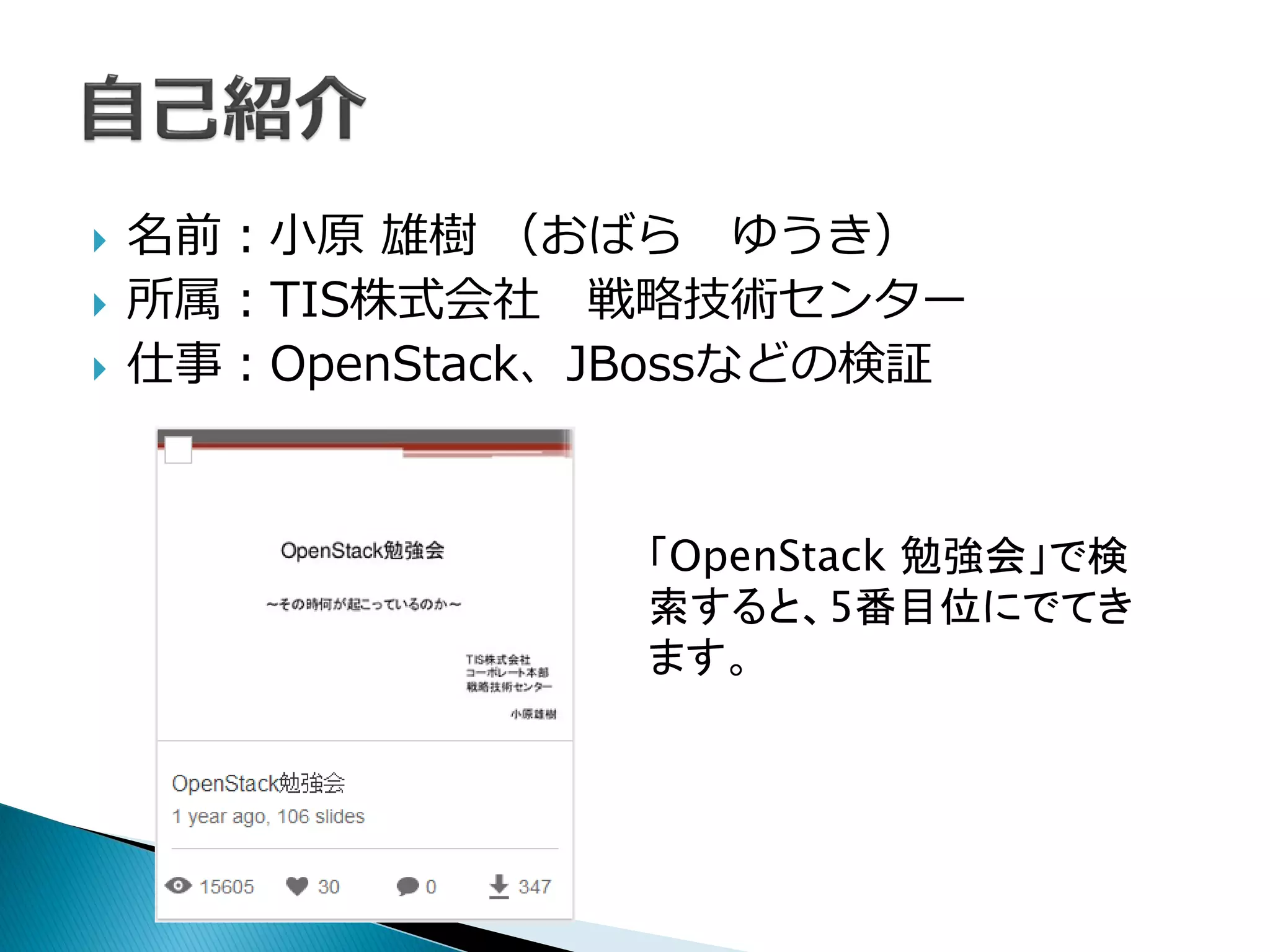 (おばら ゆうき) 所属:TIS株式会社 戦略技術センター 仕事:OpenStack、JBossなどの検証 「OpenStack 勉強会」で検 索すると、5番目位にでてき ます。