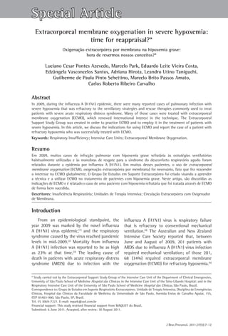 This document summarizes a case study of a 14-year-old female patient with severe hypoxemia due to lung infection who was successfully treated with extracorporeal membrane oxygenation (ECMO). Prior to ECMO, the patient had a PaO2/FiO2 ratio of 40 despite maximum ventilation support. ECMO was initiated through femoral and jugular cannulation. Over six days of ECMO support, the patient's lung function and oxygenation improved. Daily trials reducing ECMO support were successful. ECMO was discontinued on day six and ventilation support was gradually reduced. The patient survived with ECMO providing a "lung rest" period until recovery from infection and lung injury.