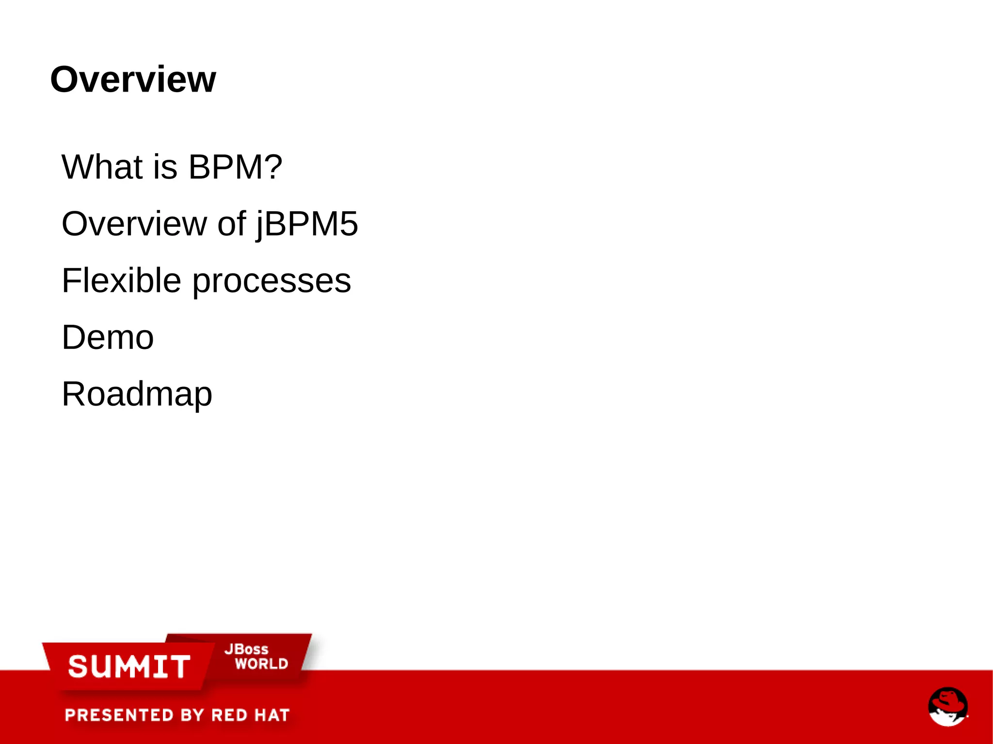 The document introduces jBPM5, an open-source business process management project. It provides a generic process engine that supports executing BPMN 2.0 processes. Key features include flexible processes using rules and events, a web-based console for management and monitoring, and integration with other domains and services. The document demonstrates the core capabilities and provides a roadmap for future versions planned to add more advanced features like simulation and adaptive processes.