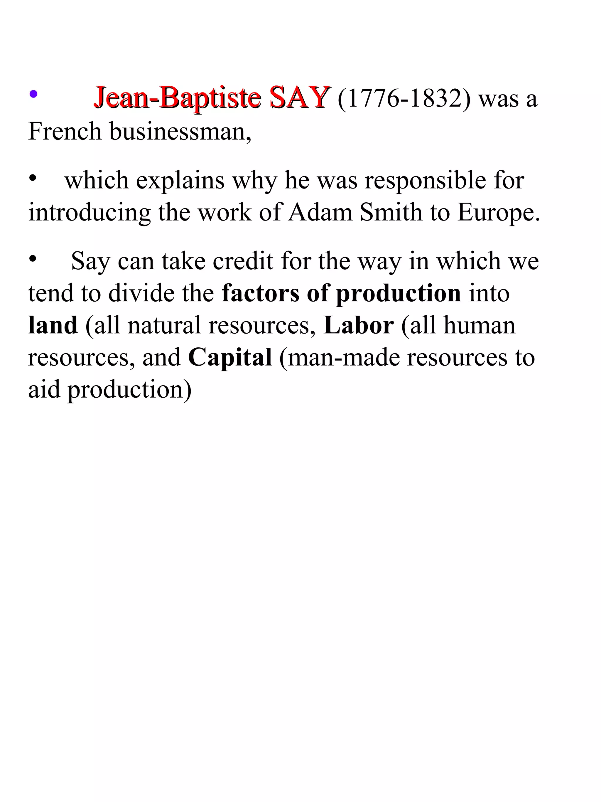 Jean-Baptiste Say introduced several important economic concepts, including distinguishing between factors of production (land, labor, capital) and introducing the concept of the entrepreneur. He is best known for "Say's Law", which states that supply creates its own demand. Say's Law was an important idea in classical economics and implied that general overproduction was impossible. It was based on ideas that savings equal investment, and that people only hold money for transactions, not as an asset. While Say's Law may have been intended to describe an equilibrium condition, it was often interpreted as being true at all times, which many classical economists like Mill disagreed with.