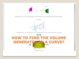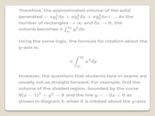 The document discusses how to find the volume generated by rotating an area bounded by a curve, a common challenge in JC math for A-levels. It emphasizes the importance of understanding integration and the visualization of volume, using the concept of Riemann sums to approximate area. Students are advised to approach the problem by visualizing the object and carefully calculating the volume by subtracting the volume generated by a line from that generated by the curve.