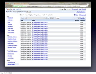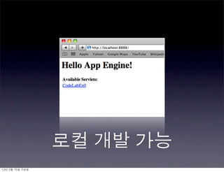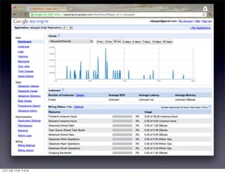 This document discusses Google App Engine (GAE), a platform as a service. It lists Code Labs exercises that teach using GAE's features like the datastore, memcache, task queues, and channels API. It notes that GAE uses the GoogleDataStore service API instead of relational databases or JDBC. The document also mentions the admin console, billing history, and deploying to appspot.com. It concludes with additional topics to cover like JavaEE, Google plugins for Eclipse, and using GWT or HTML5 with GAE.