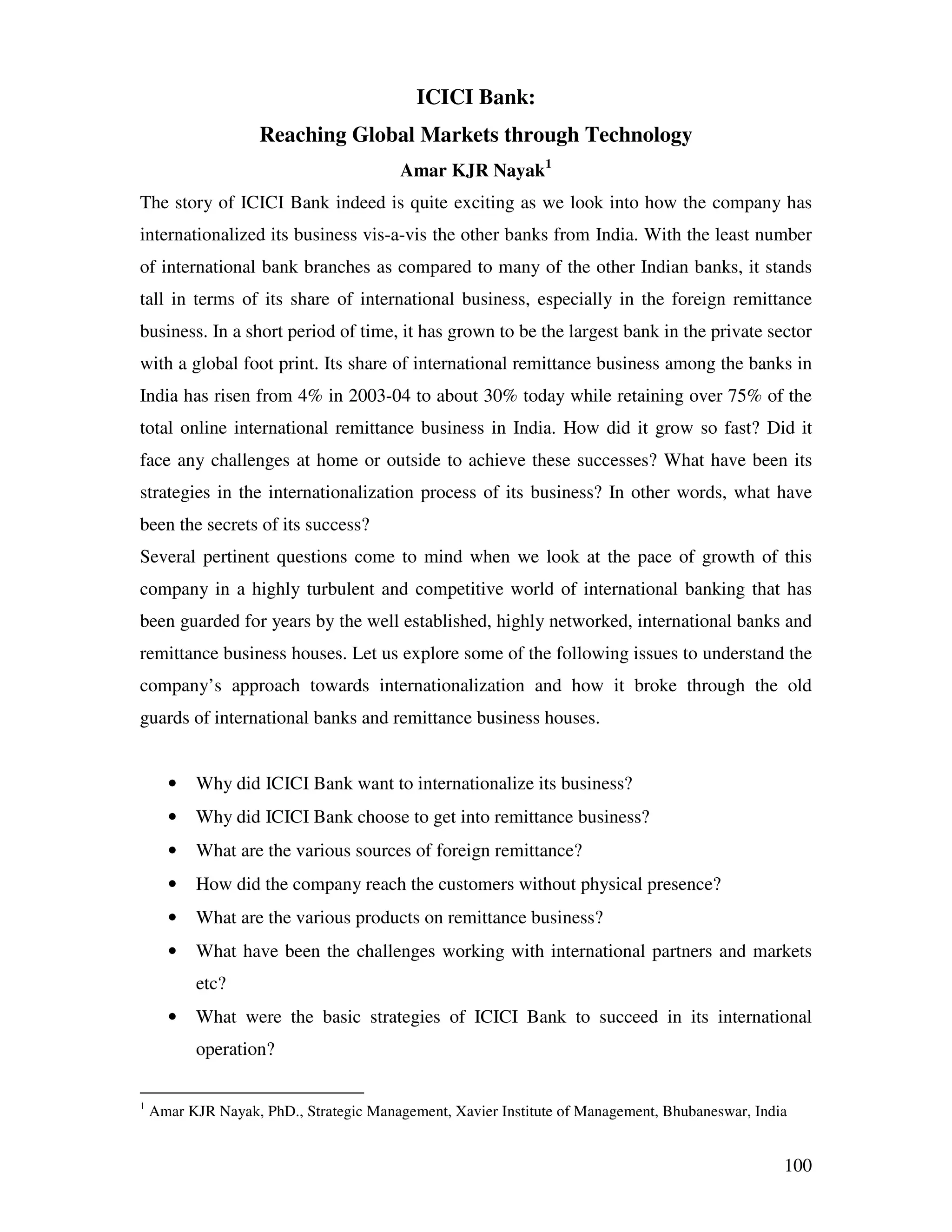 This document summarizes the internationalization of ICICI Bank's business, particularly its growth in the foreign remittance business. It discusses how ICICI Bank grew to become the largest private sector bank in India with a global footprint, despite having fewer international branches than other Indian banks. The document examines ICICI Bank's strategies for entering the international remittance market, including leveraging technology to reach customers without a physical presence and partnering with international players. It provides context on the global remittance market and Indian banking industry.