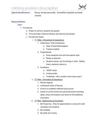 This document provides a position description for a Game Host Team Member role with Youth Alive ministry. The role involves greeting guests, setting up and facilitating games, and maintaining a welcoming environment at services and events. The schedule requires a minimum commitment of two services per month. Training and support is provided. Responsibilities include prayer, setup, guest assistance during services, cleanup, and some recruiting efforts.
