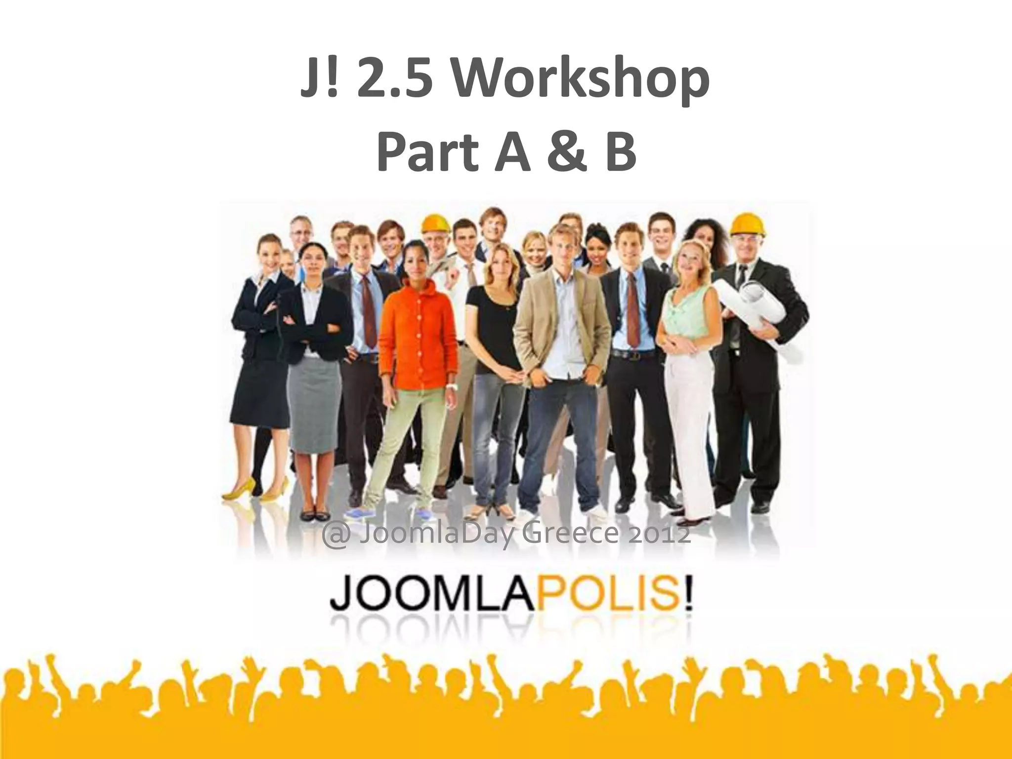 The document outlines the agenda for a Joomla 2.5 workshop, including an introduction to Joomla fundamentals, installation, adding content, and social networking extensions. Part A covers the basics of Joomla, installation, and content creation. Part B focuses on social networking solutions like Community Builder and paid membership features with CBSubs. The workshop aims to help attendees get started with Joomla, experiment locally, and learn how to enhance a Joomla site with social and membership functionality.
