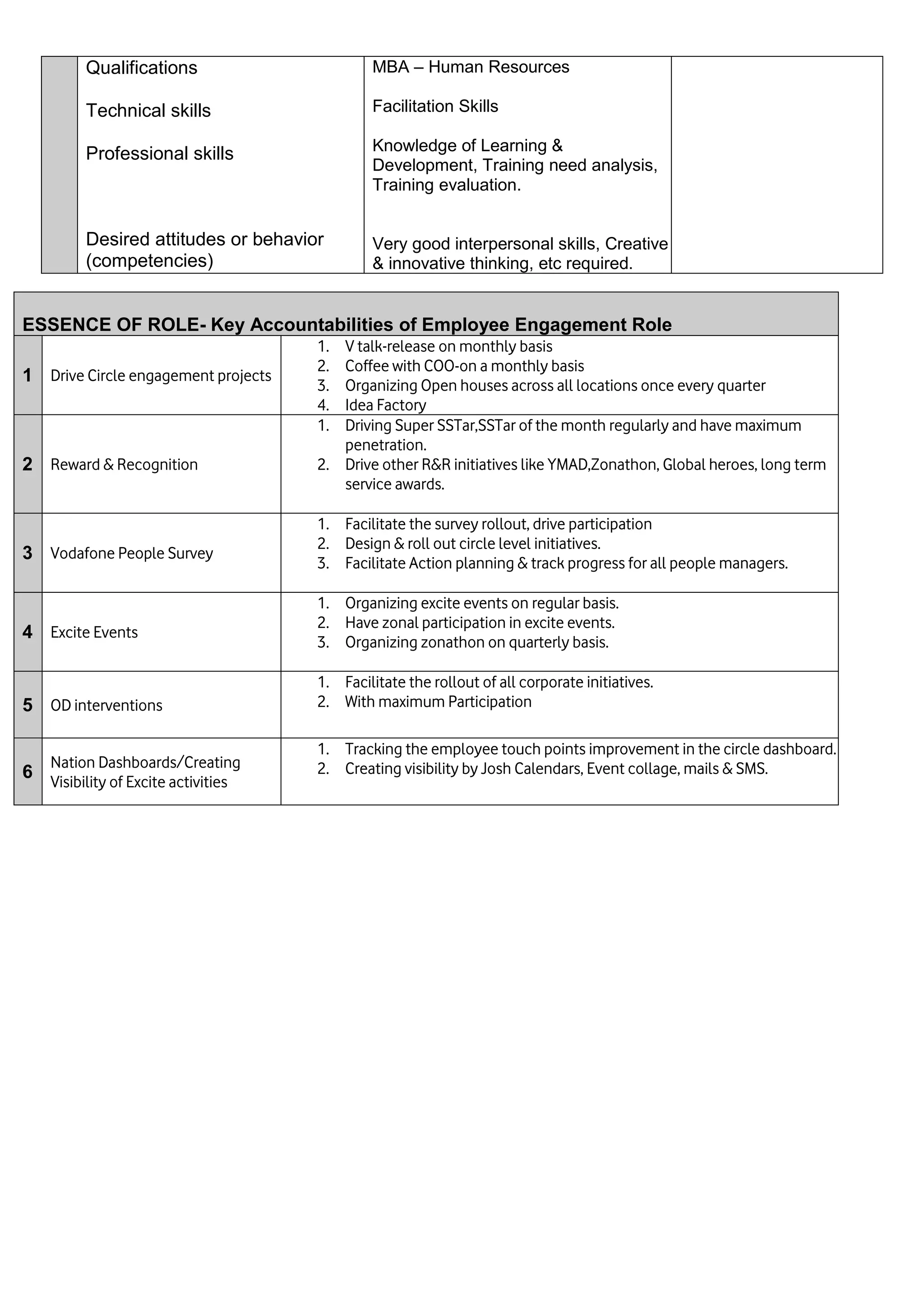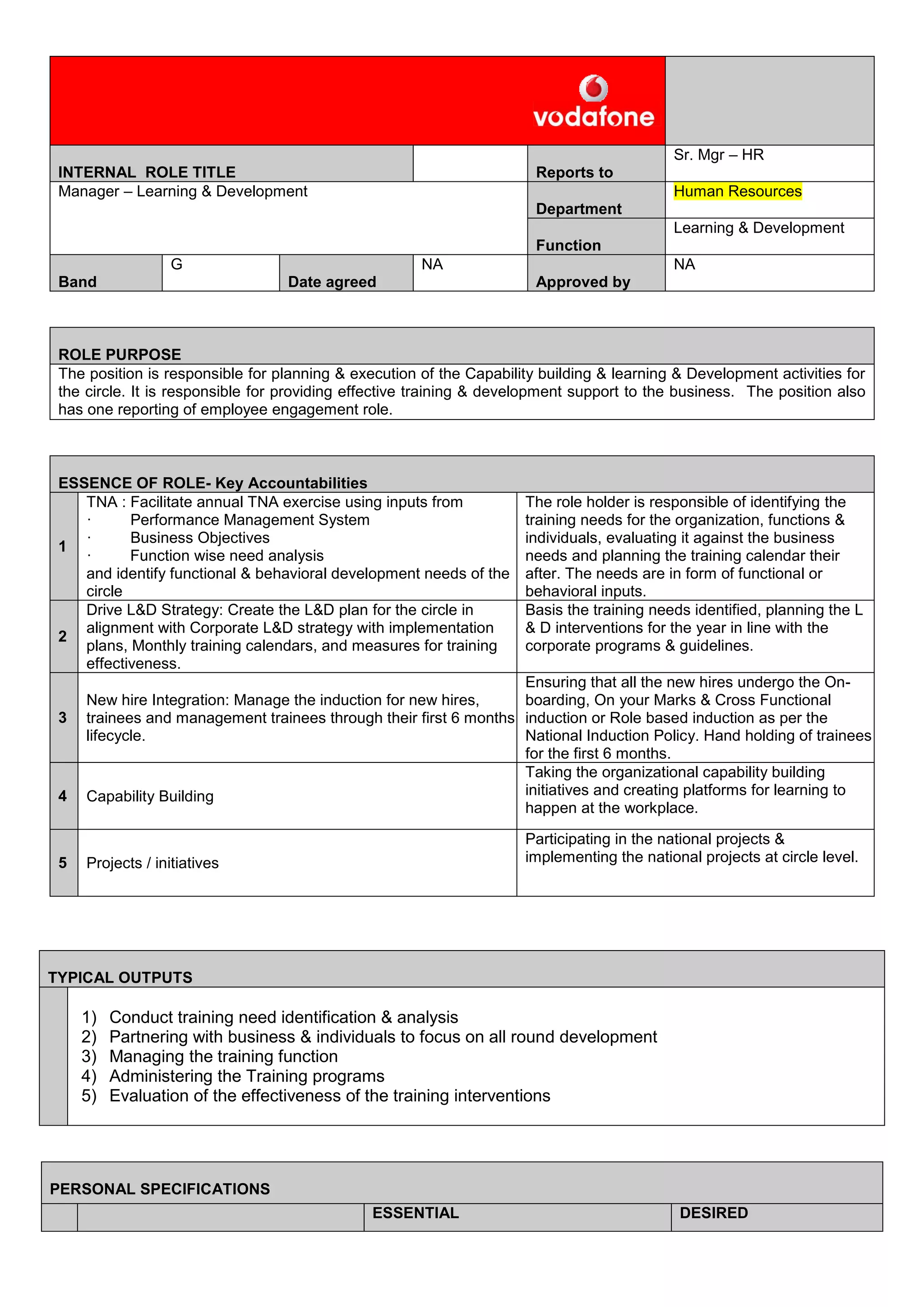 The role is responsible for learning and development activities in the circle, including conducting training needs assessments based on various inputs, creating an annual L&D plan aligned with corporate strategy, and managing new hire onboarding programs. Key responsibilities are identifying training needs, planning the training calendar, onboarding new hires for their first six months, developing capabilities, and implementing national projects at the circle level. The role also drives various employee engagement initiatives like monthly townhalls, recognition programs, and excitement events to increase participation.