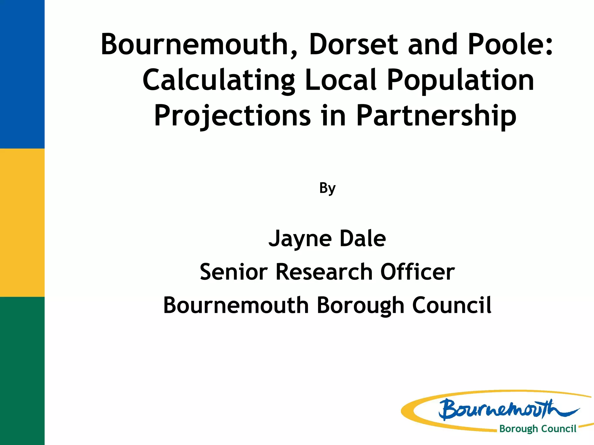The document discusses population projections created jointly by Bournemouth, Dorset and Poole to support strategic planning in the area. The three authorities purchased shared software and developed a consistent methodology to produce trend-based, policy-based, and natural change projections using local and national data. The projections are used across departments and to inform housing and school planning, with benefits of shared resources but also difficulties coordinating between the three separate authorities.