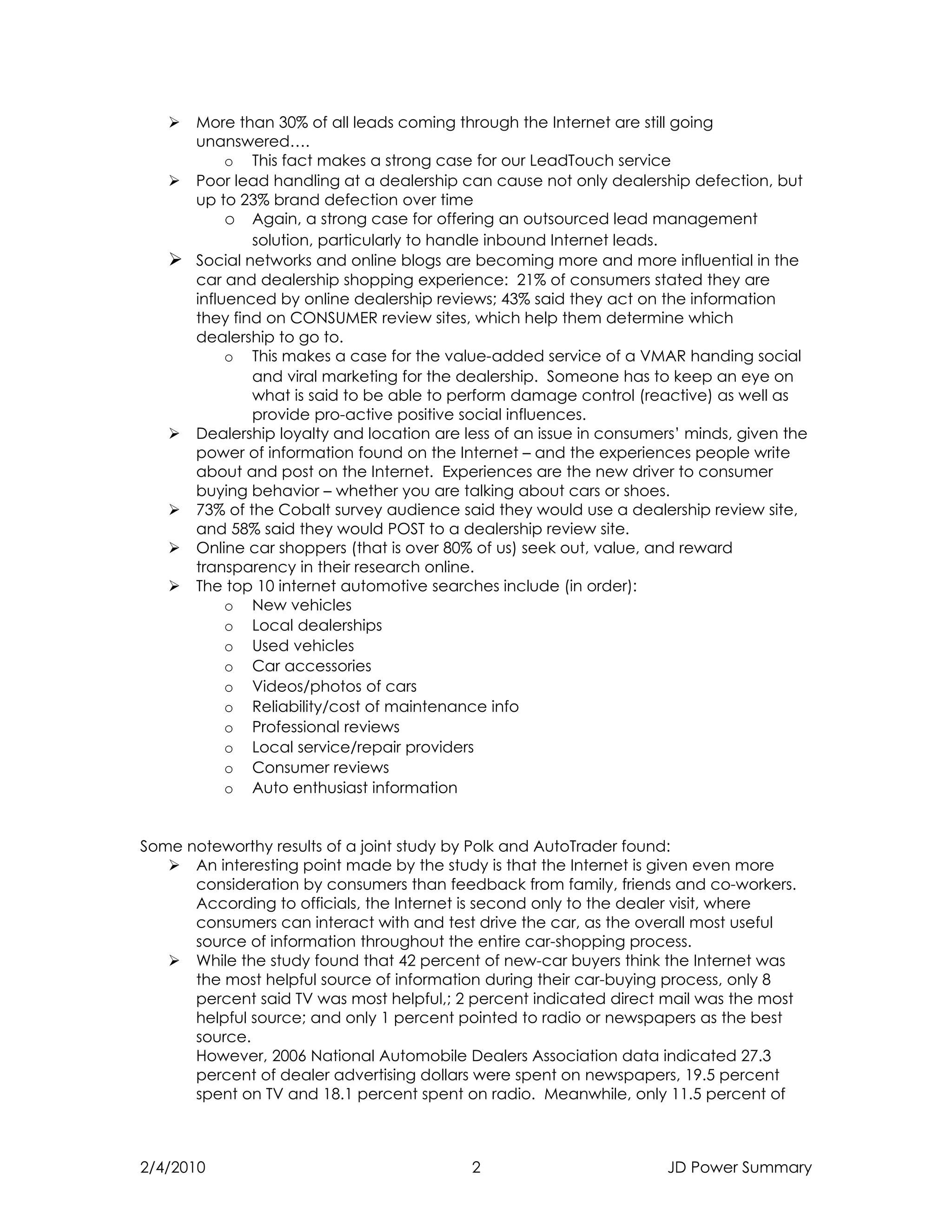 1. Social media, websites, and mobile are becoming major influencers in the car buying process. Dealers are adopting mobile and social media marketing.