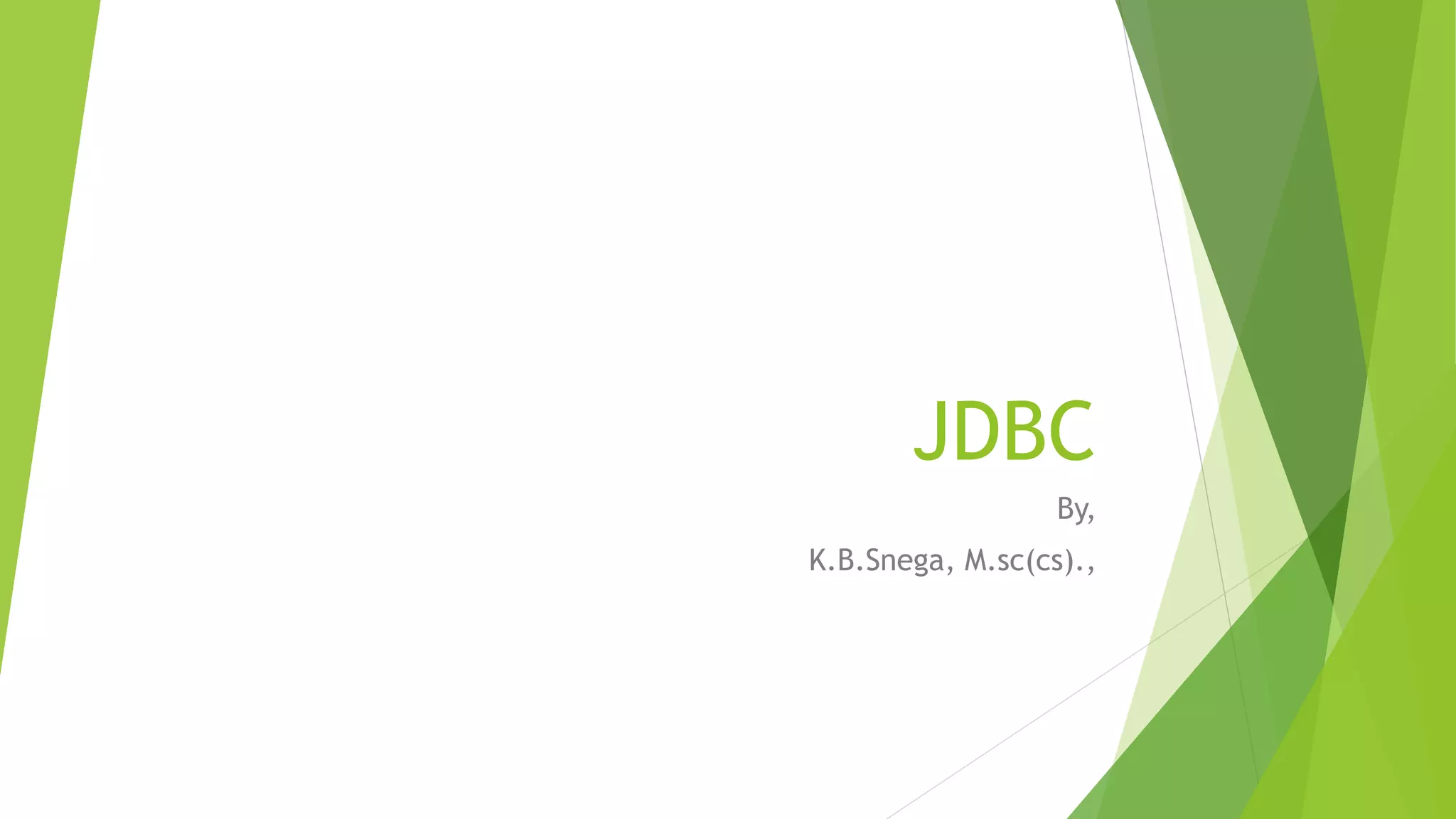 This document discusses JDBC (Java Database Connectivity), which is a standard Java API that allows Java programs to connect to databases. It discusses the architecture of JDBC, the four types of JDBC drivers, and the steps to connect to a database which include defining the connection URL, establishing the connection, creating a Statement object, executing queries, processing results, and closing the connection. It also discusses the three types of Statement objects (Statement, PreparedStatement, CallableStatement) and JDBC Data Sources, which provide an alternative to DriverManager and allow connection pooling and distributed transactions.