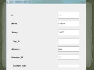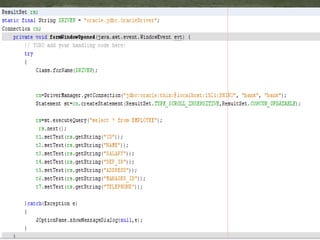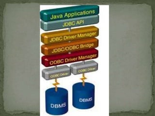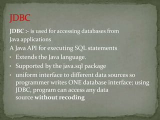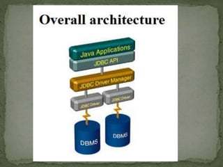 JDBC (Java Database Connectivity) is an API that allows Java programs to execute SQL statements. It provides a uniform interface for connecting to different database systems and supports accessing databases via the java.sql package. The JDBC architecture involves loading a JDBC driver, defining a connection URL, establishing a connection, creating Statement objects to execute queries, and processing ResultSets.