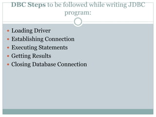 The document discusses connecting Java applications to MS Access and MySQL databases using JDBC. It provides code examples to demonstrate loading drivers, establishing connections, executing queries, retrieving results, and closing connections for basic CRUD (create, read, update, delete) operations. It also covers differences between Statement and PreparedStatement interfaces and using stored procedures with CallableStatement.