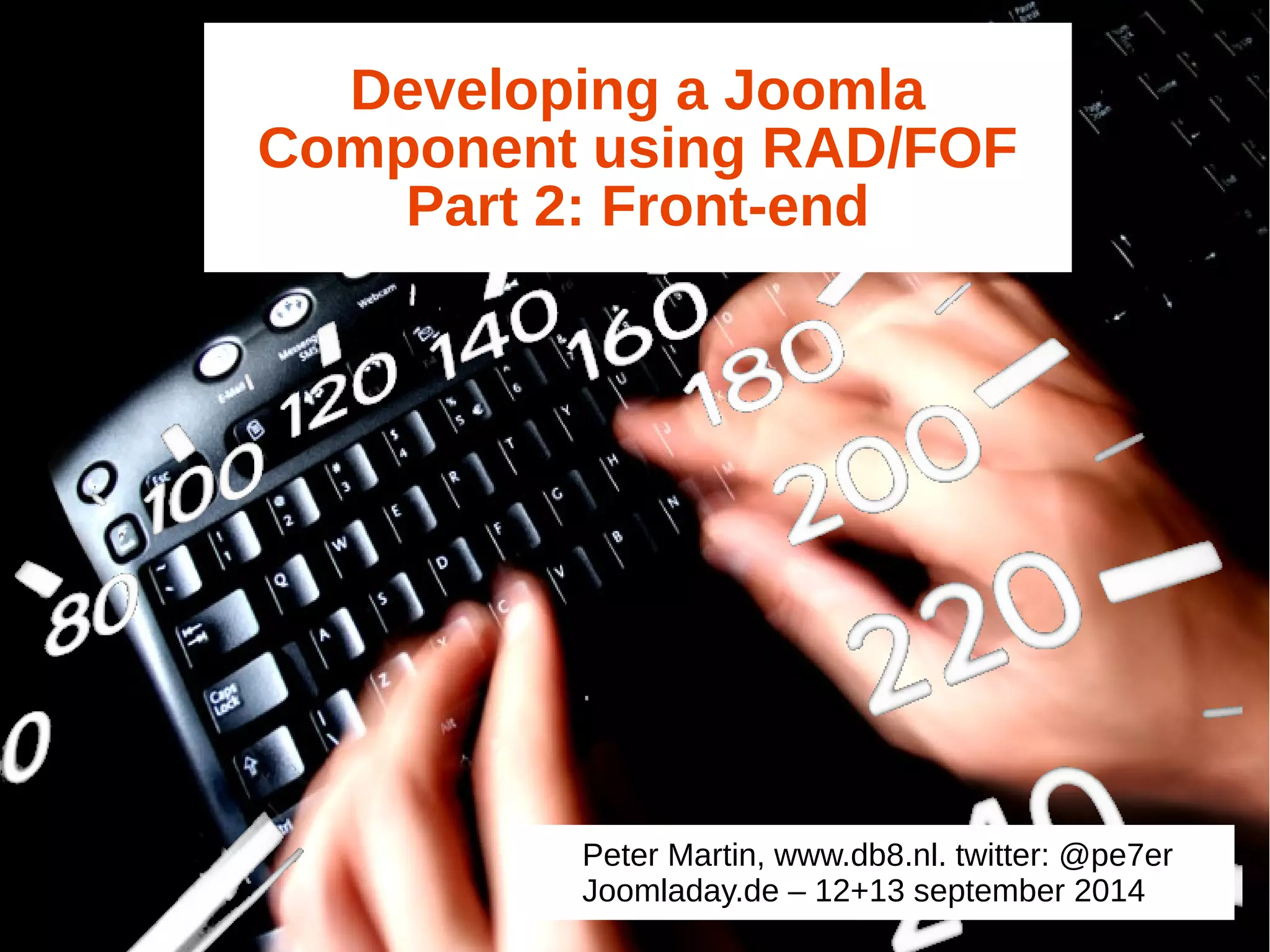The document details a presentation on developing a Joomla component using Rapid Application Development (RAD) and the Framework on Framework (F0F). It covers both back-end and front-end functionality of the 'db8locate' component, which is intended for managing and displaying locations on a Google map, along with guidance on setting up a local development environment, utilizing Git, and troubleshooting errors. Additional resources and examples are provided for further reference.